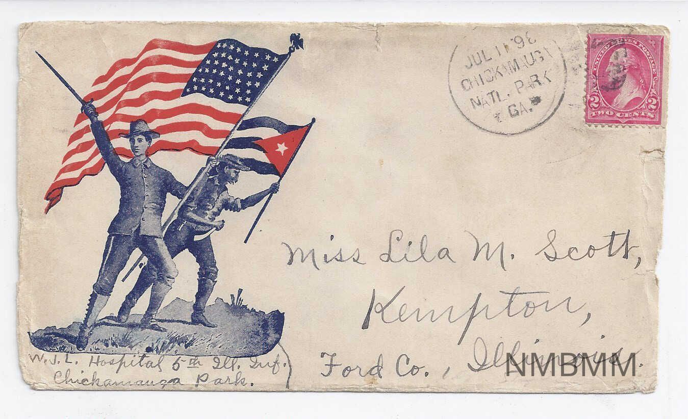 Envelope addressed to Miss Lila M. Scott Kempton, Illinois Ford Co. The postmark reads "July 11 '96 Chickmauga Natl. Park GA." A red one cent stamp with the image of George Washington is in the upper right corner of the envelope. The left side of the envelope features a United States flag held by a rough rider with a sword in his other hand, and a Cuban flag held by another soldier. Handwritten under the image is the following: "W.J.L. Hospital 6th Ill. Inf. Chickamuga Park."
