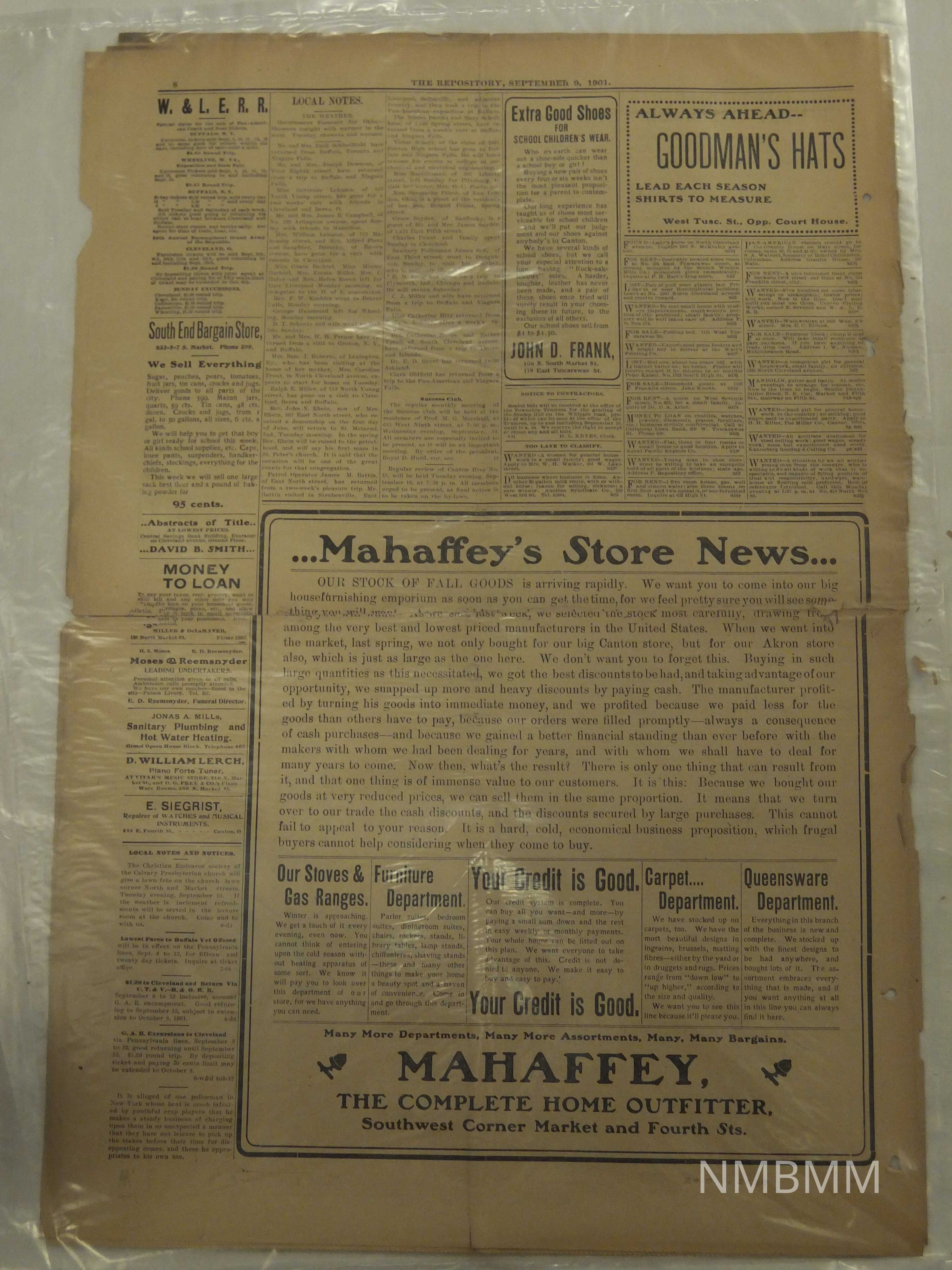 09/09/1901 Canton Evening Repository. Headline reads "Deep Confidence Expressed By All That President Will Recover--Physicians Give Greatest Hope--Mrs. McKinley Shows Remarkable Fortitude." Articles about the grave condition of President William McKinley.Collection