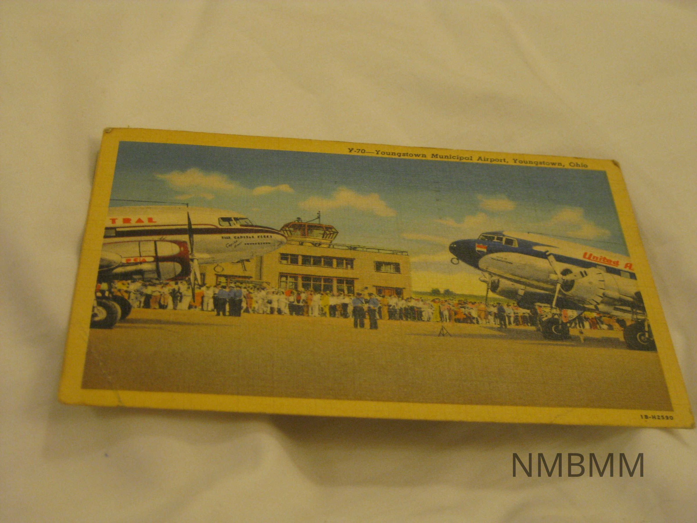 This item is a postcard with a color image of planes at an airport terminal. Caption reads "Y-70 - Youngstown Municipal Airport, Youngstown, Ohio." Received May 21, 1943. 5.5 by 3.5