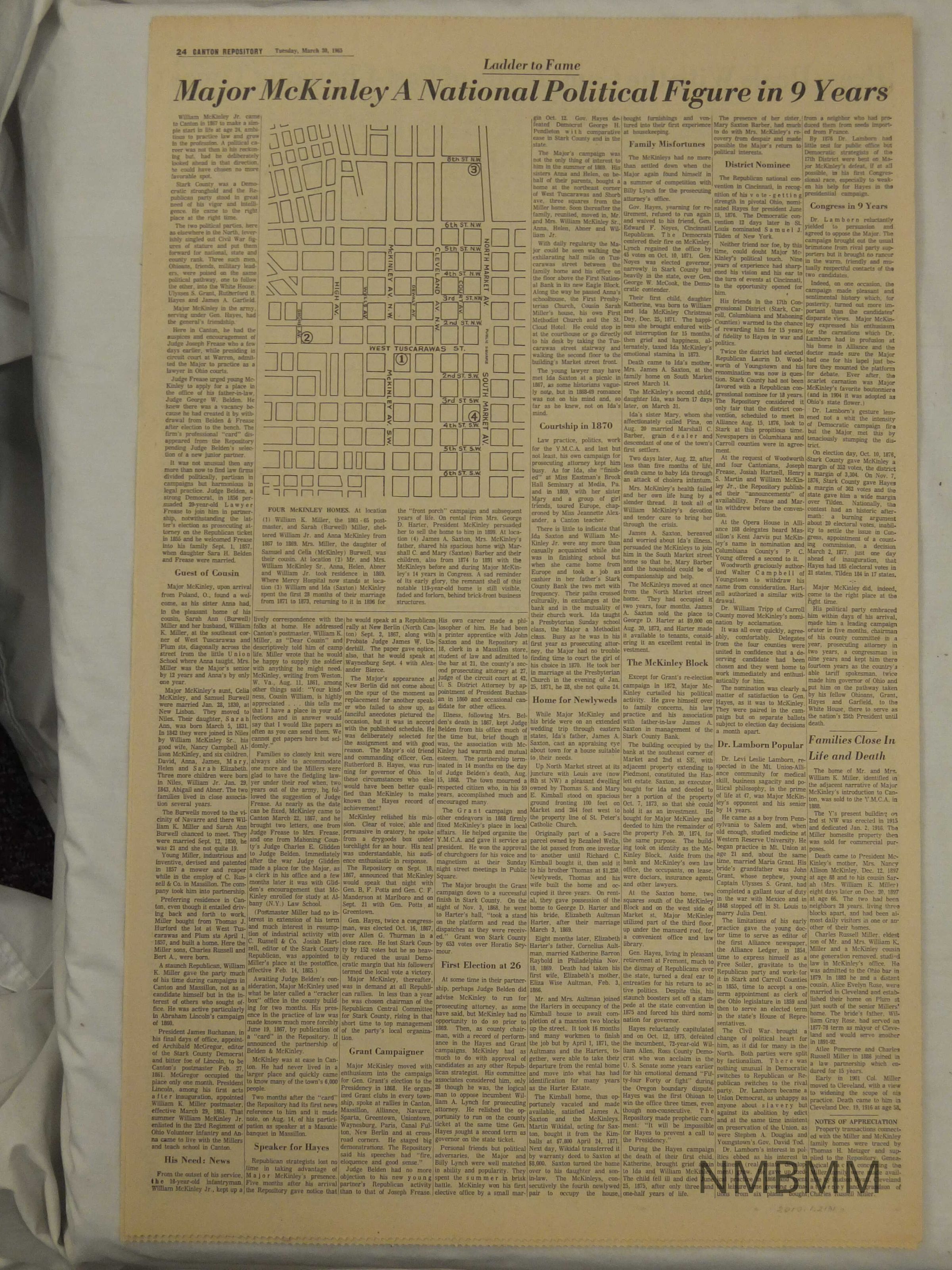 03/30/1965 Canton Repository. Headlines read "Cavalcade of World History." (Sketches from 1815-1963) "From Settlement Trails to Space Age. The Repository's History: Our Town's Vivid Record of Enterprise and Achievement." Articles about the settlement of Canton, Ohio, the Saxton Family, William McKinley's personal life, political life, presidency and assassination.