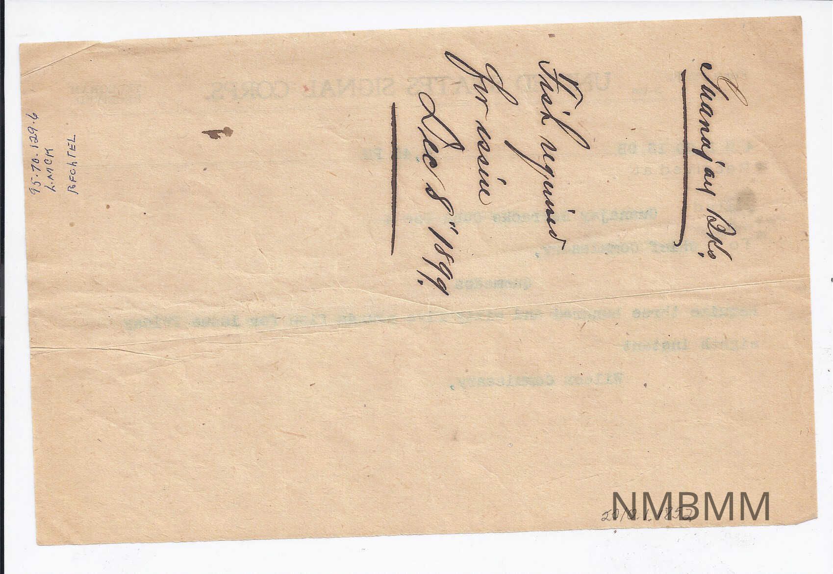 Telegram from Guanajay to Quemados, Cuba. The telegram consists of a tyepwritten message on yellowed paper, using form 125 B. The message, dated Dec. 4, reads as follows: "Guanajay Barracks Cuba Dec 4 6,45 PM Chief Commissary, Quemados Require three hundred and sixty five pounds fish for issue friday eighth instant Wilcox Commissary,"