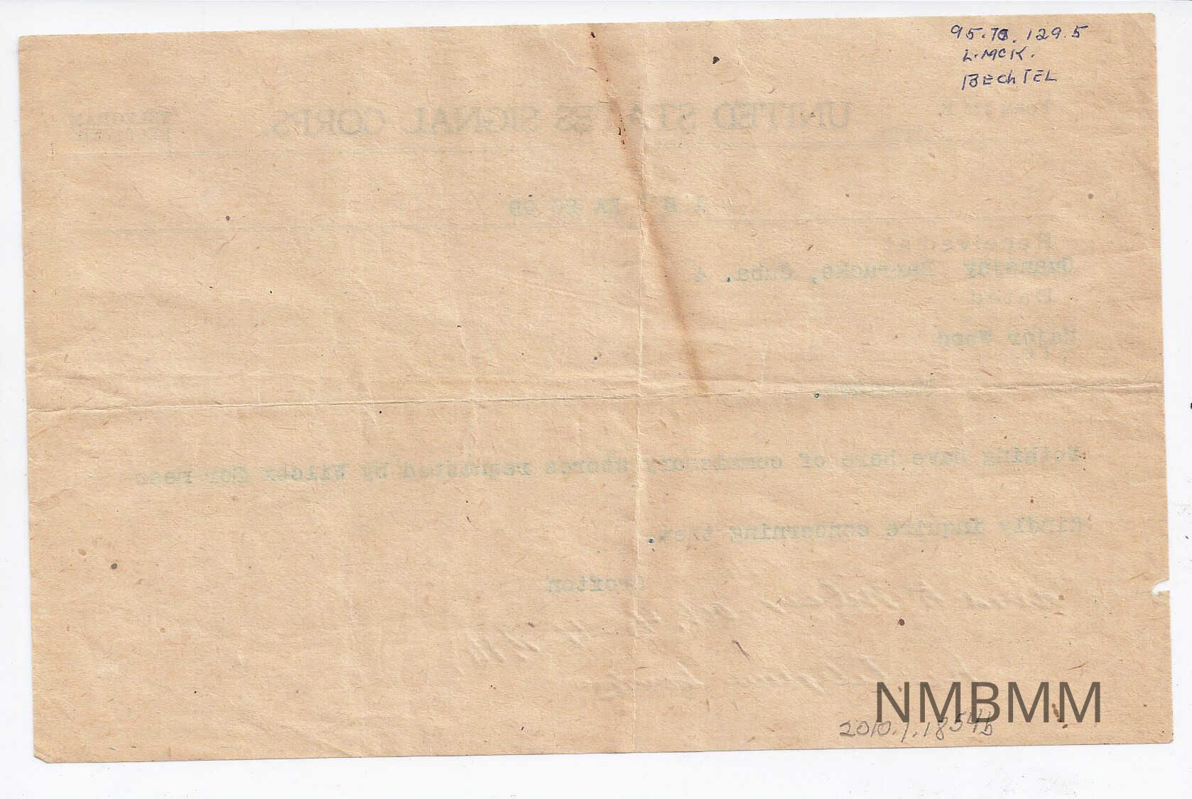 Telegram from Crofton, to Major Wood at Quemados. The telegram consists of a tyepwritten message on yellowed paper, using form 125 B. The message reads as follows: "Nothing here of commissary stores requested by Wilcox for mess Kindly inquire concerning them. Crofton." A handwritten note is as the bottom of the page and reads as follows: "Fwd. to Wilcox Oct. 4.- 4 A.M. re telegram book."