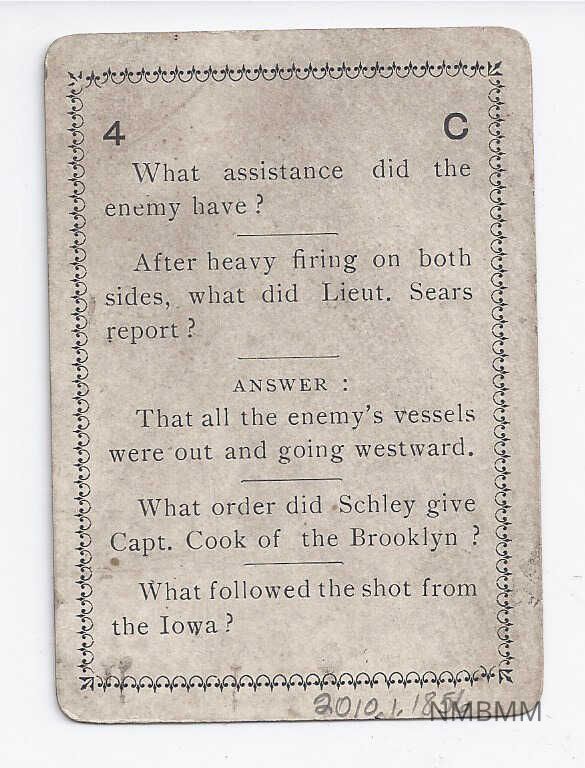 Playing card from a game consisting of a picture of the Spanish American War on the back and questions and answers on the front.