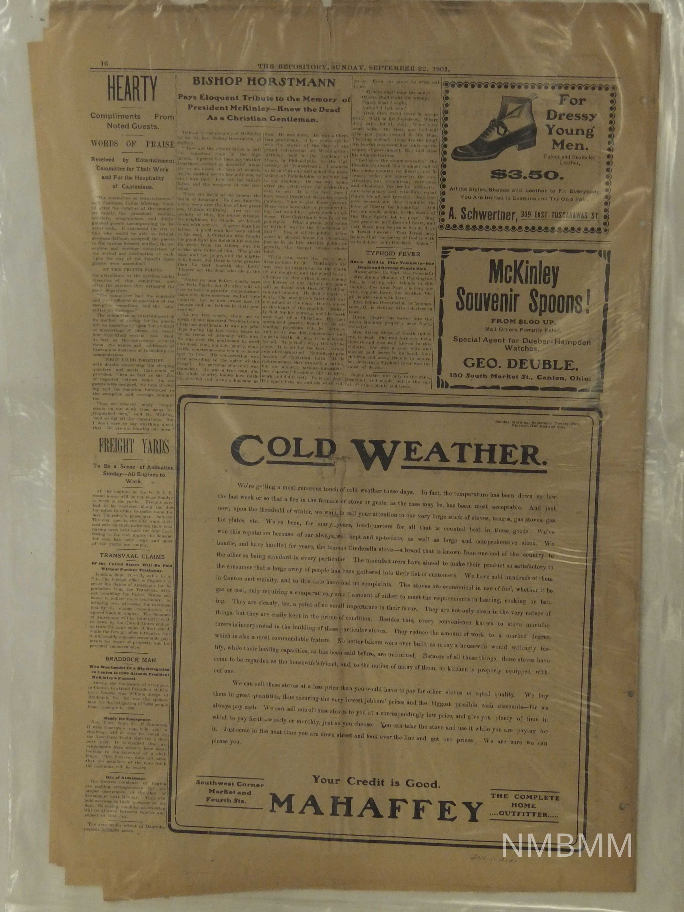 09/22/1901 Canton Sunday Repository. Pages 9 to 16. Headline reads "Cherish It." Articles about the funeral and tributes to the memory of President William McKinley.Collection