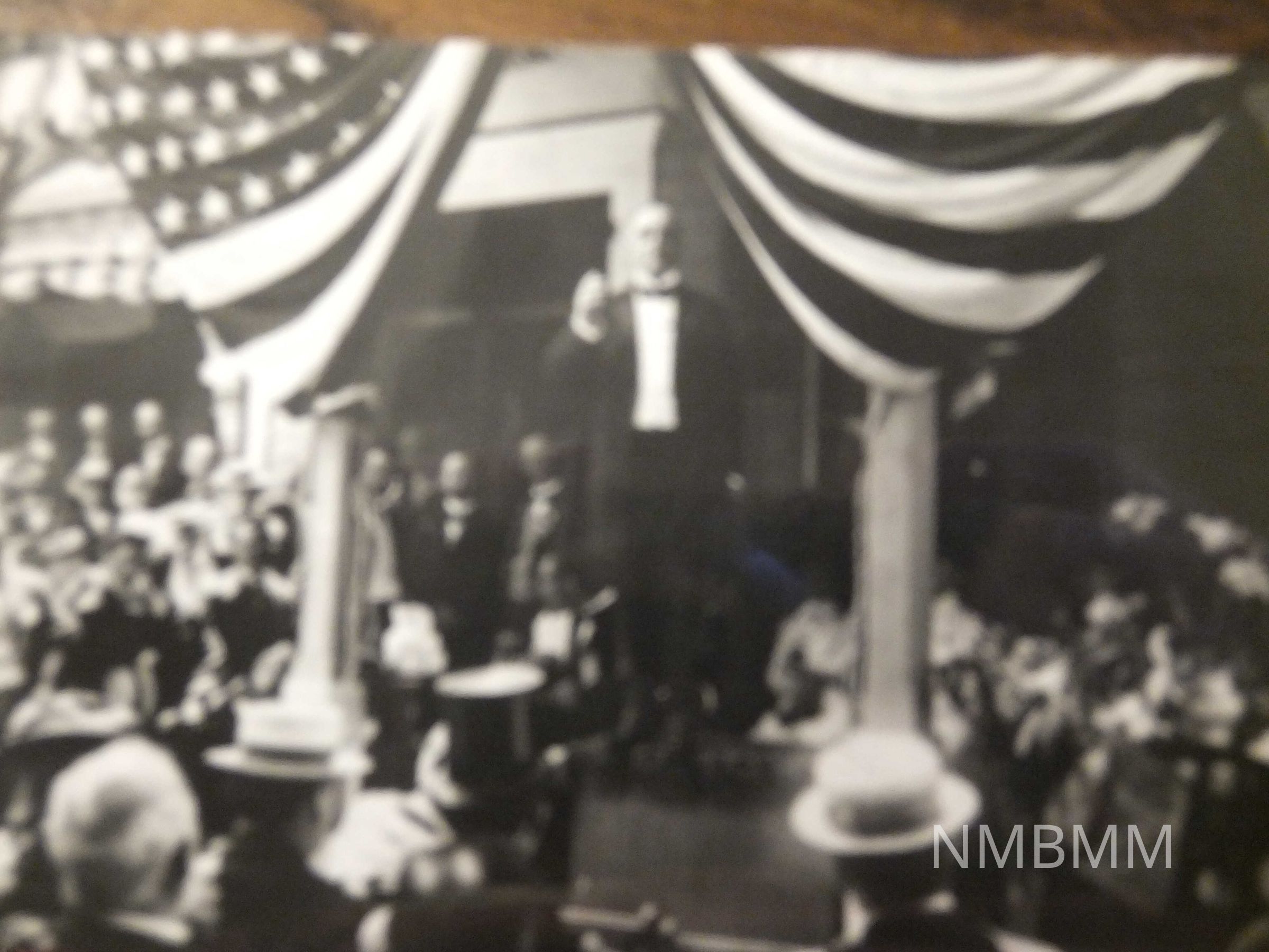 Postcard. The front shows William McKinley accepting the nomination for his second term as President on July 12, 1900. The image shows President McKinley standing on a platform, flanked by bunting, with many listeners.
