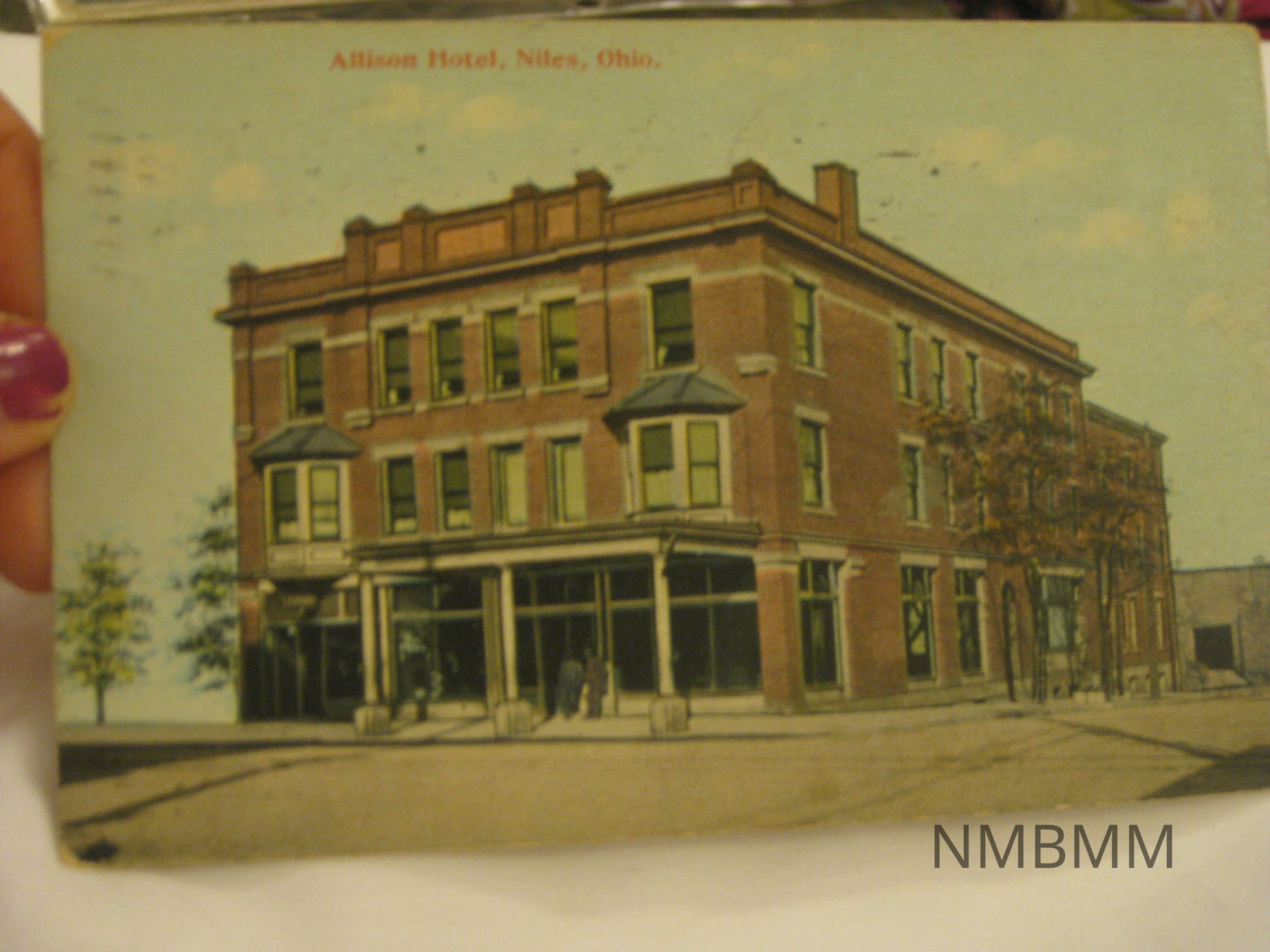 This item is a postcard with a color image of Allison Hotel in Niles, Ohio. Received September 23, 1914. Published by Kennedy and Ferguson, Prescription Druggists. 5.5 by 3.5