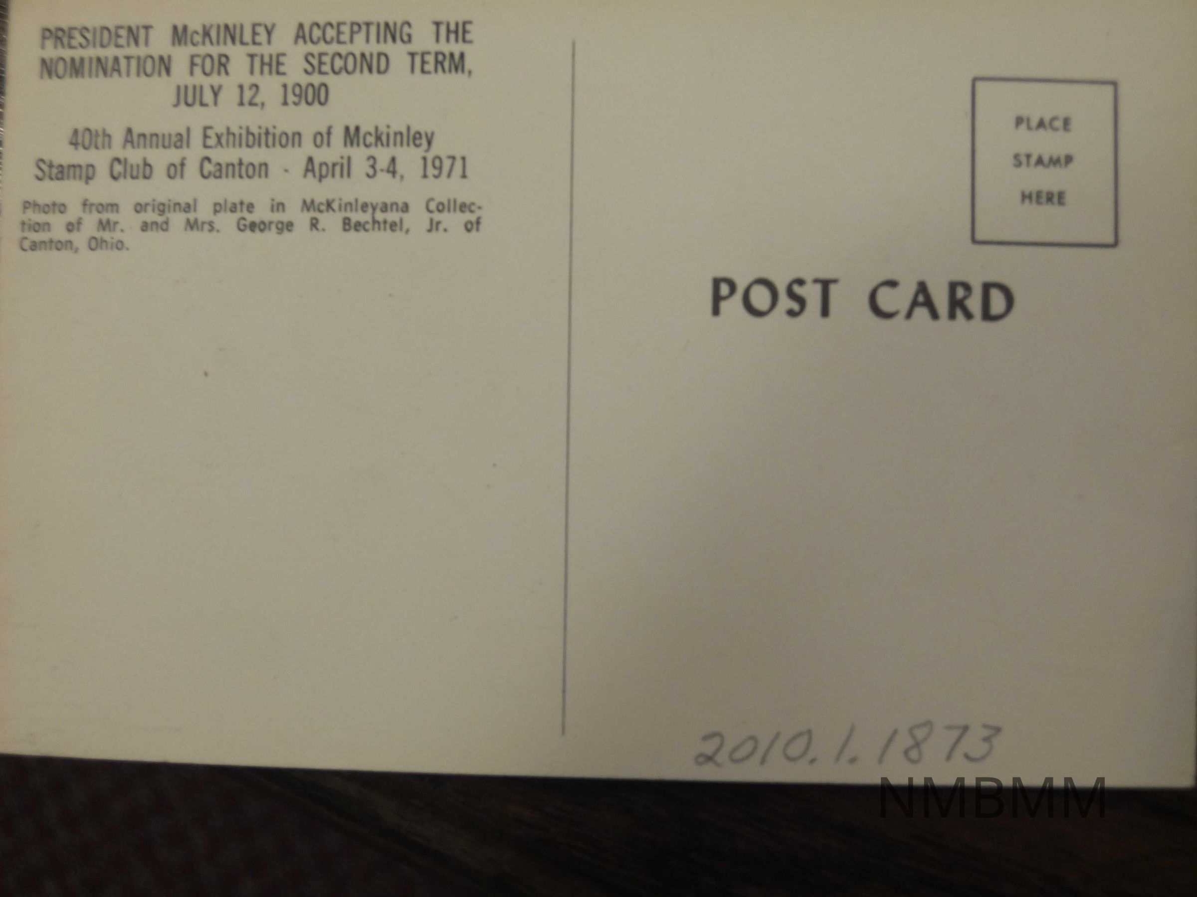 Black and white postcard. The front shows William McKinley accepting the nomination for his second term as President on July 12, 1900. The image shows President McKinley standing on a platform, flanked by bunting, with many listeners.