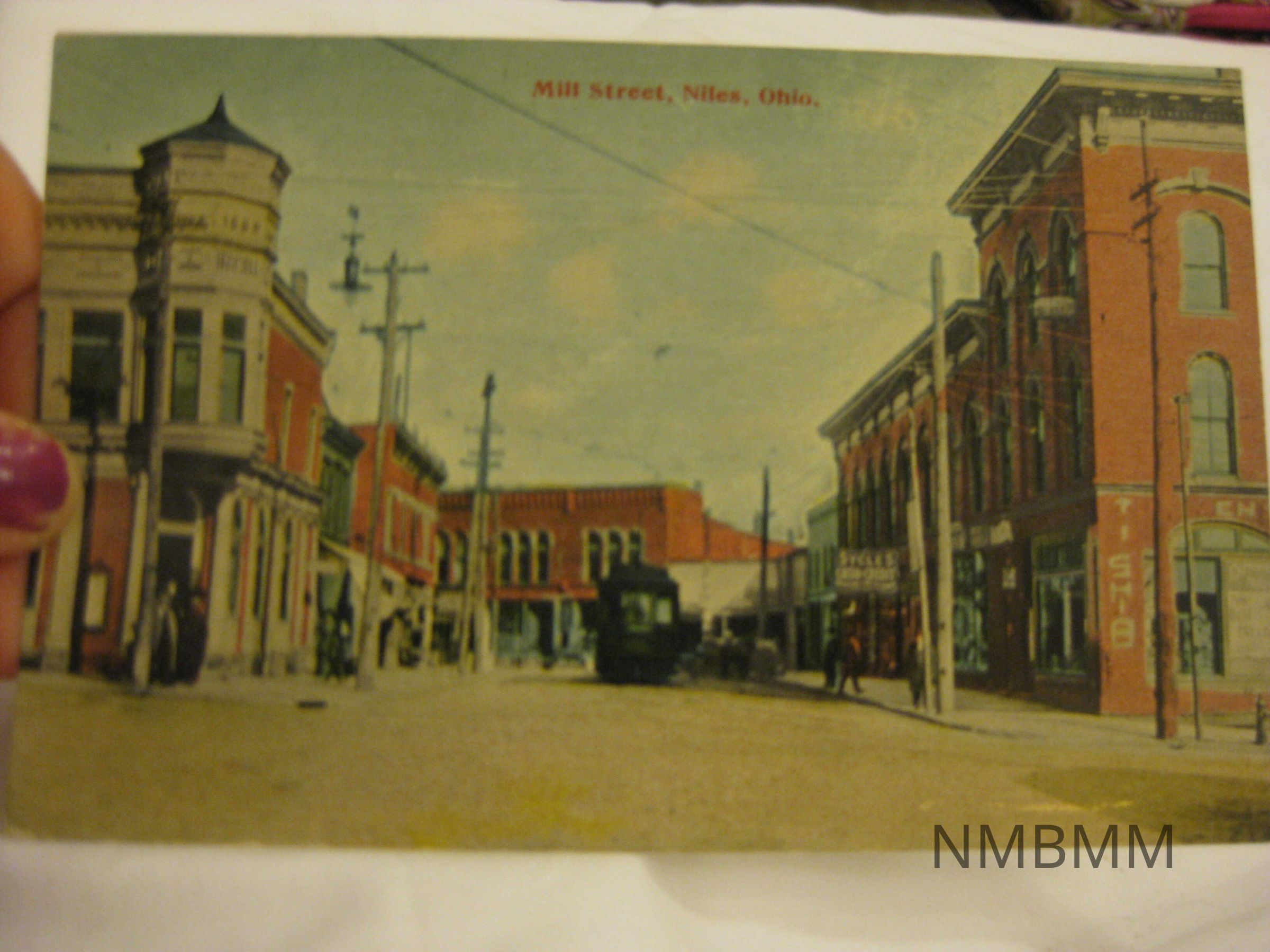 This item is a postcard with a color image of Mill Street in Niles, Ohio. Made by the J. Bouton and Co. 5.5 by 3.5.Collection
