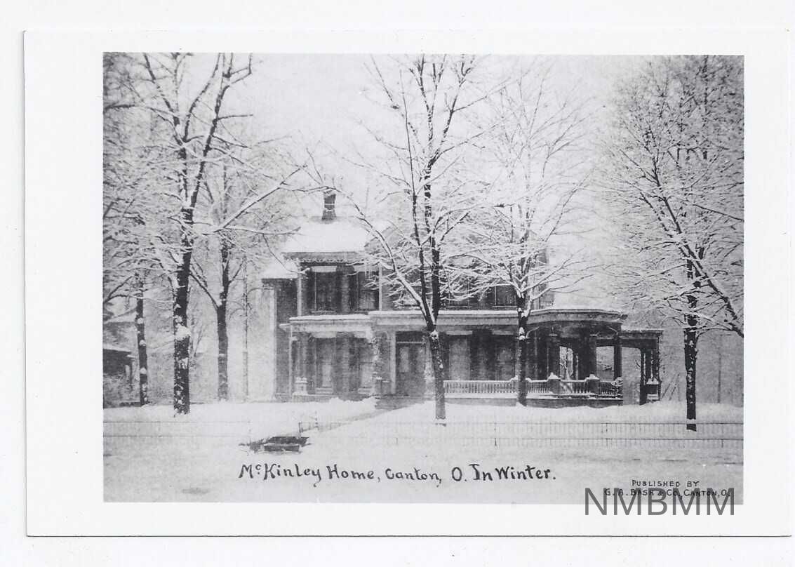 Black and white postcard. The image shows the McKinley Home Canton, Ohio in winter. The image is reproduced from a photo published by G.A. Bash and Co. Canton, O, as is noted in the lower right corner of the image.