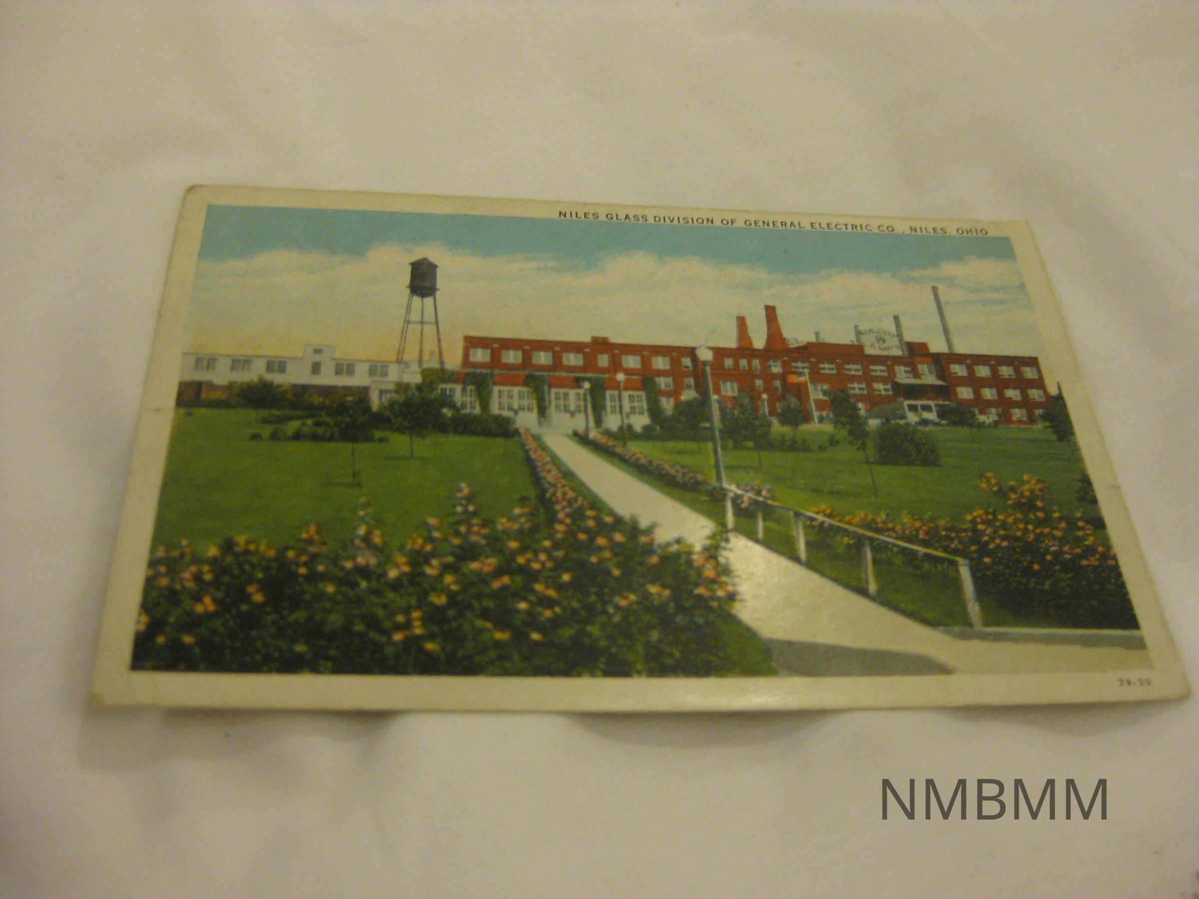 This item is a postcard with a color image of the Niles Glass Division of the General Electric Company in Niles, Ohio. Received on June 27, 1937. 5.5 by 3.5.Collection