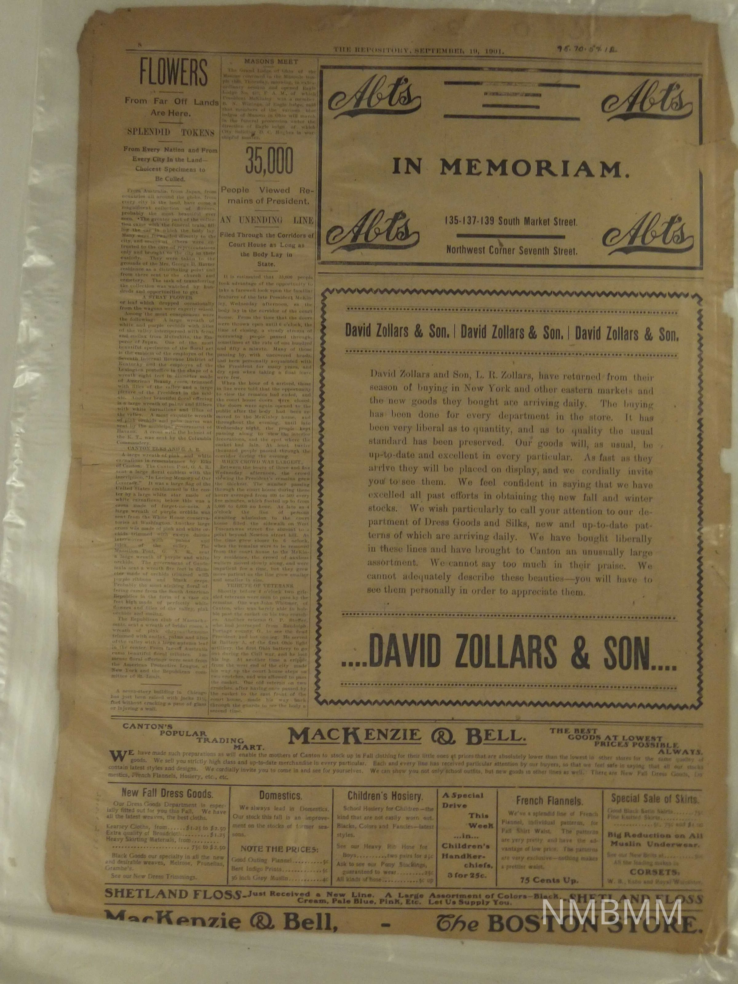09/19/1901 Canton Evening Repository. Headline reads "The Body In The Old Home. Casket Bearing All That Is Mortal of the Remains of the Late President McKinley Lay all Night in The Home He Loves so Dearly." Articles about McKinley Funeral.Collection
