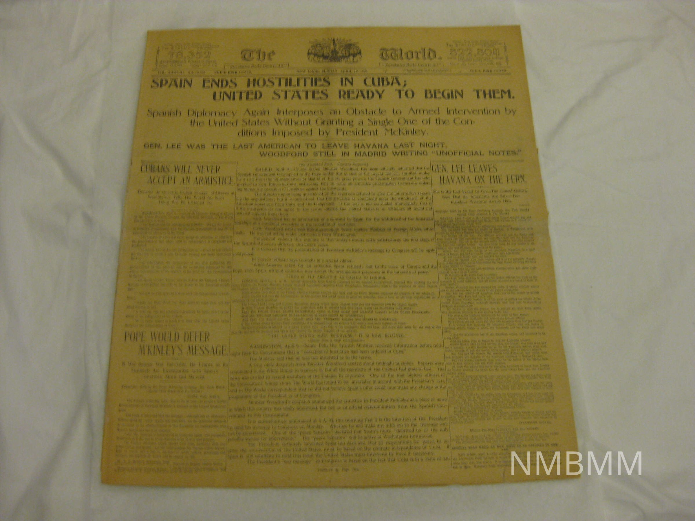 This is a copy of The World newspaper published on April 10, 1898. The titles read "Spain Ends Hostilities in Cuba; United States Ready to Begin Them", "Cubans Will Never Accept an Armistice", "Pope would Defer McKinley's Message", and "Gen. Lee Leaves Havana on the Fern." Discolored, some tears.