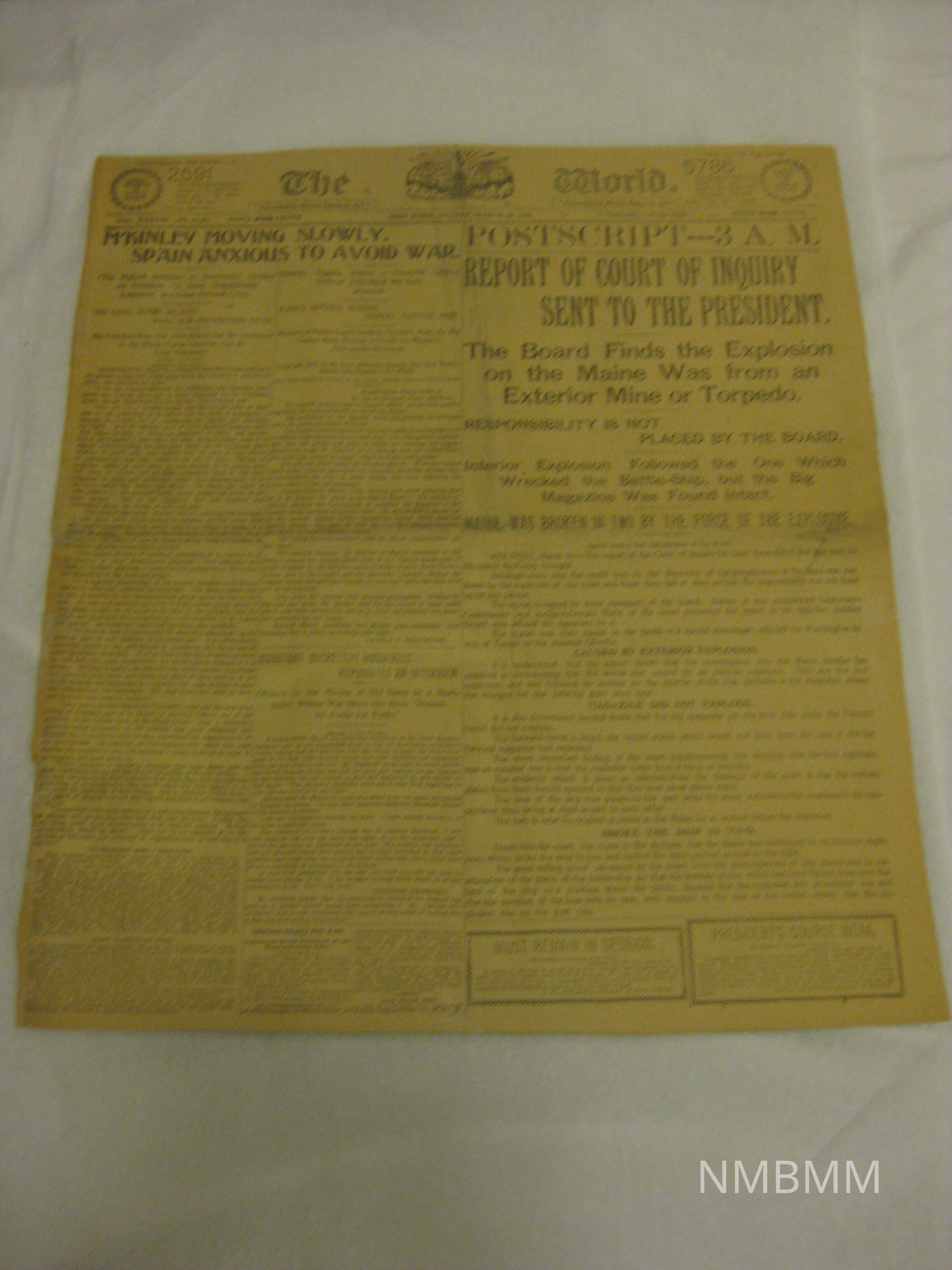 This is a copy of The World newspaper published on March 20, 1898. The headlines read "McKinley Moving Slowly, Spain Anxious to Avoid War", "Report of Court of Inquiry Sent to the President. The Board Finds the Explosion on the Maine Was from an Exterior Mine or Torpedo." Discolored, some tears.