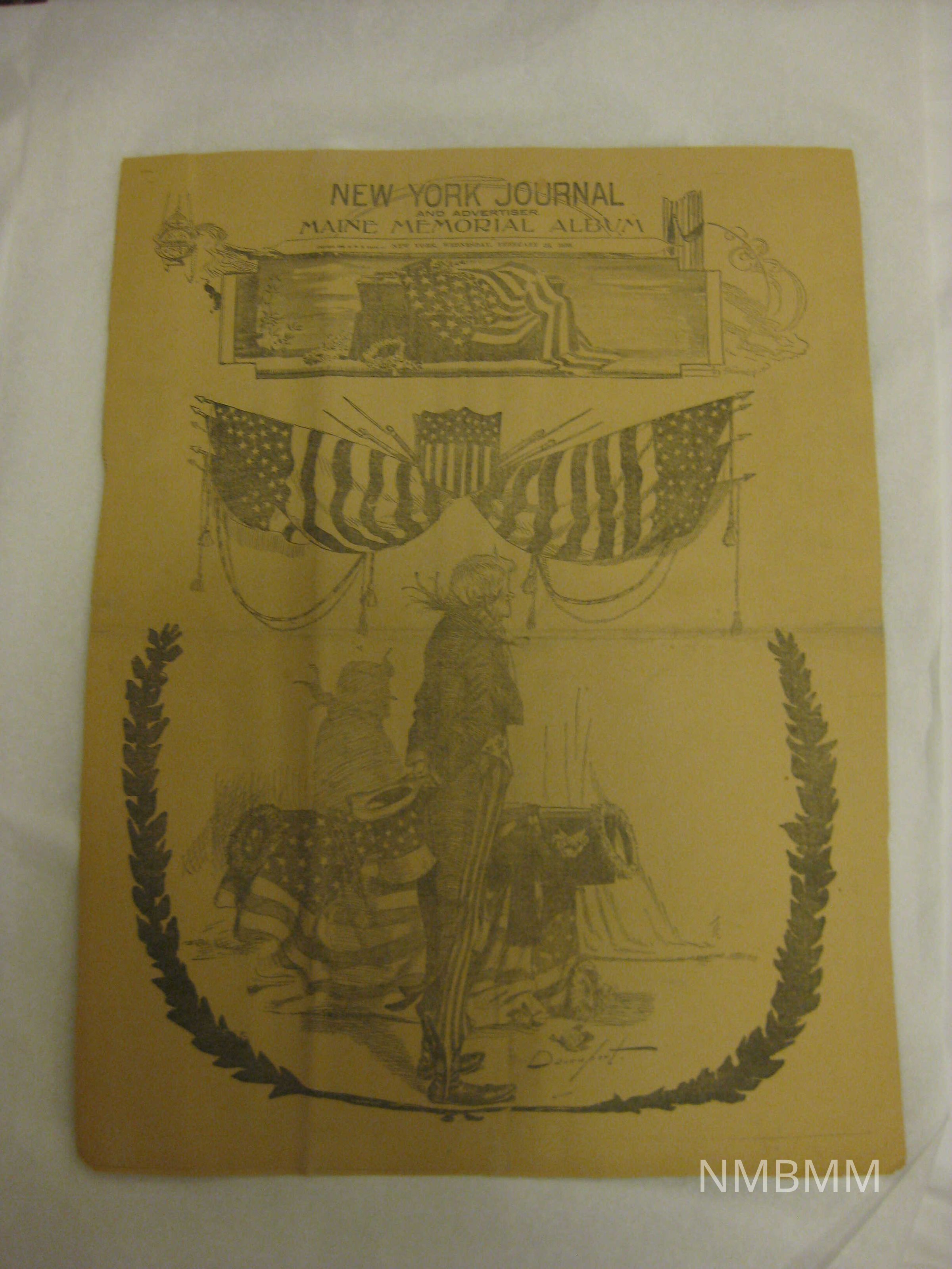 This is a copy of The New York Journal published on February 28, 1898. It was published as the Maine Memorial Album. The cover has a picture of Uncle Sam standing over a casket underneath two American flags.Collection