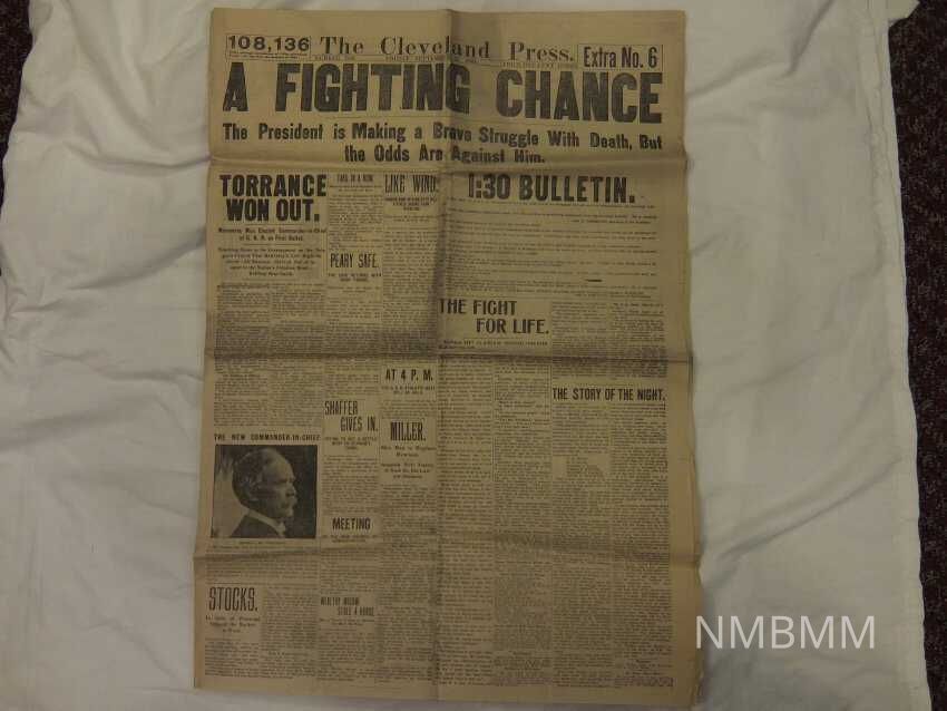 The item is a newspaper by The Cleveland Press from September 13, 1901 detailing President McKinley's struggle to stay alive after being shot in Buffalo, New York, The headline reads " A Fighting Chance: The President is Making a Brave Struggle with Death, but the Odds are Against Him."