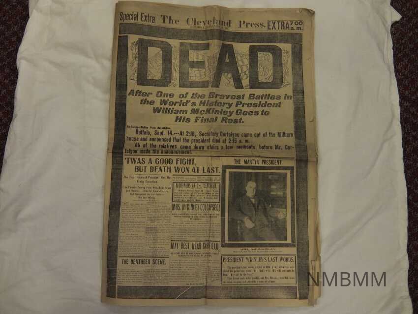 The item is a newspaper by The Cleveland Press dated September 14, 1901, with the headline "DEAD". On the bottom of the front page is a portrait of President McKinley.Collection