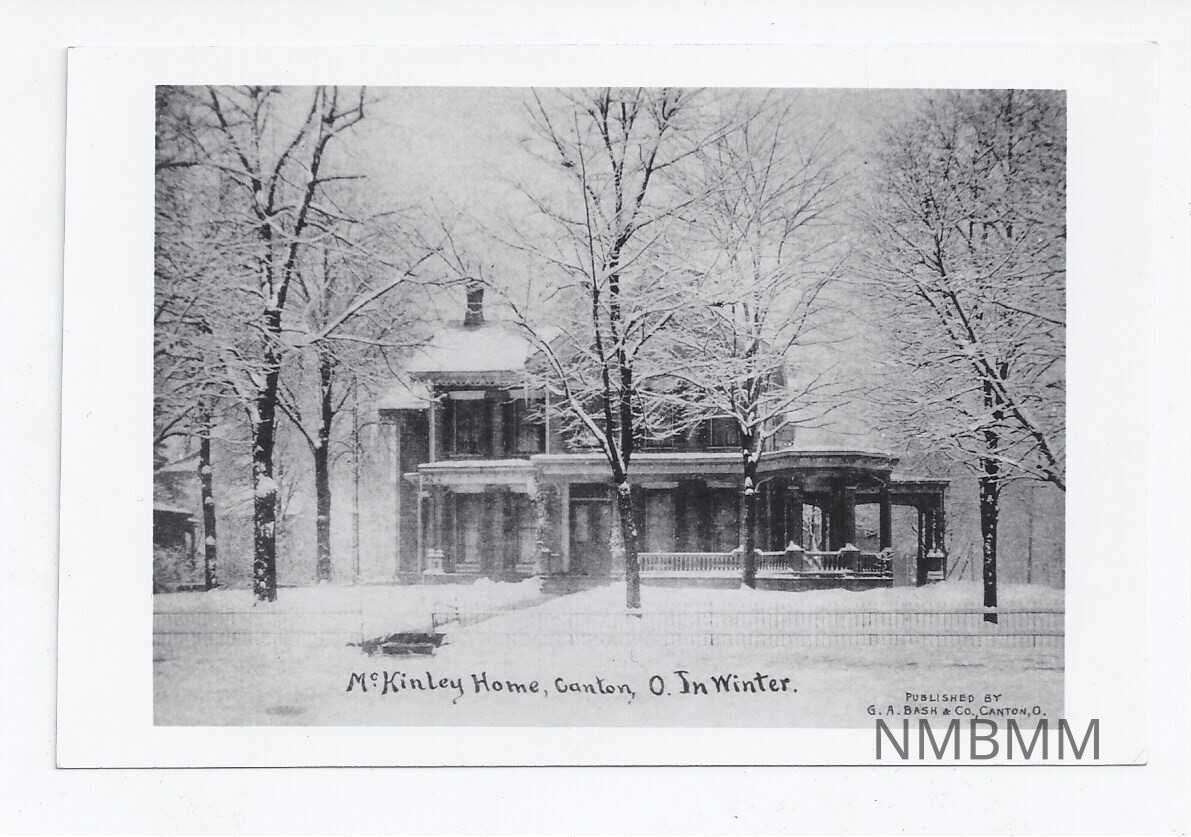 Black and white postcard. The image shows the McKinley Home Canton, Ohio in winter. The image is reproduced from a photo published by G.A. Bash and Co. Canton, O, as is noted in the lower right corner of the image. The back of the postcard is as follows. The words "Post Card" along with the notation to "Place Stamp Here" are on the right of the card. On the left of the card is "THE MCKINLEY HOME IN WINTER MARKET AVE. NORTH CANTON, OHIO 44th Annual Exhibition of MCKINLEY STAMP CLUB OF CANTON April 26-27, 1975. Number 2 of a Series Photo from Original Plate in McKinleyana Collection of Mr. & Mrs. George R. Bechtel Jr. of Canton, Ohio"