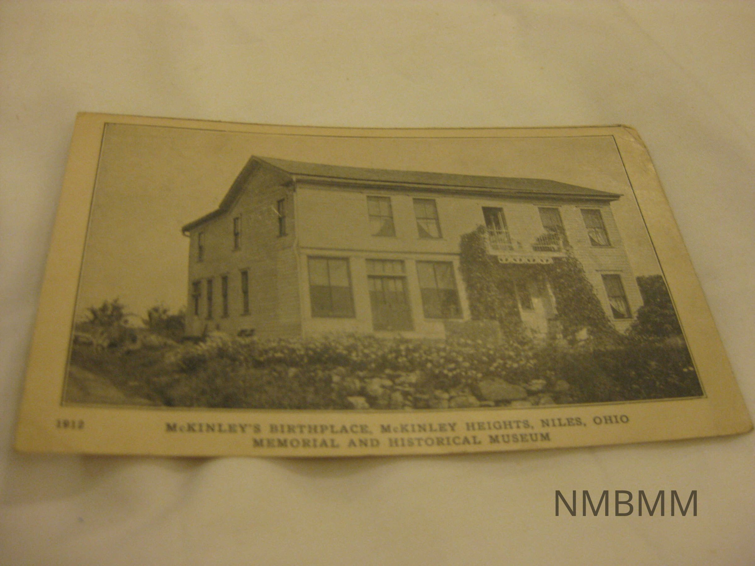 This item is a postcard with a black and white image of McKinley's Birthplace, Niles, Ohio. Text reads "McKinley's Birthplace, McKinley Heights, Niles, Ohio. Memorial and Historical Museum." 5.5 by 3.5.