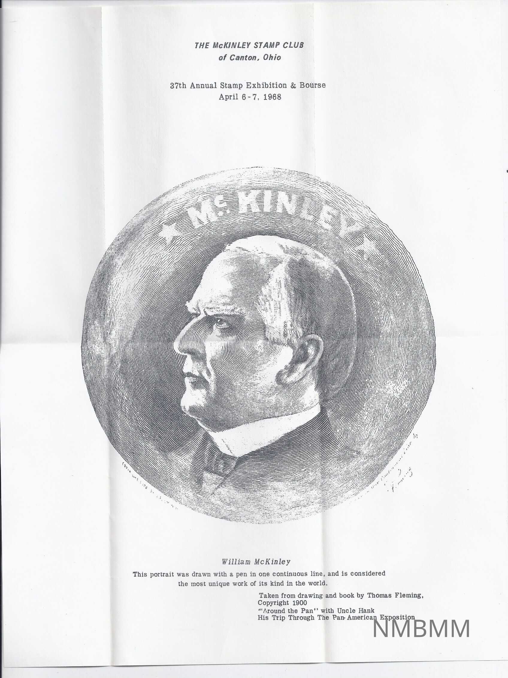 McKinley Stamp Club Flyer. The flyer is in black ink and printed on white paper. The flyer is as follows. The words "McKinley Stamp Club of Canton Ohio" are in the header. Directly beneath the header is the subheader "37th Annual Stamp Exhibition & Bourse April 6-7, 1968." Directly beneath the subheader is the same image of McKinley by Thomas Fleming as is on the matching envelope (2010.1.1927a). The caption reads: 'William McKinley This portrait was drawn with a pen in one continuous line, and is considered the most unique work of its kind in the world. Taken from drawing and book by Thomas Fleming, Copyright 1900 "Around the Pan" with Uncle Hank His Trip Through The Pan-American Exposition.'Collection