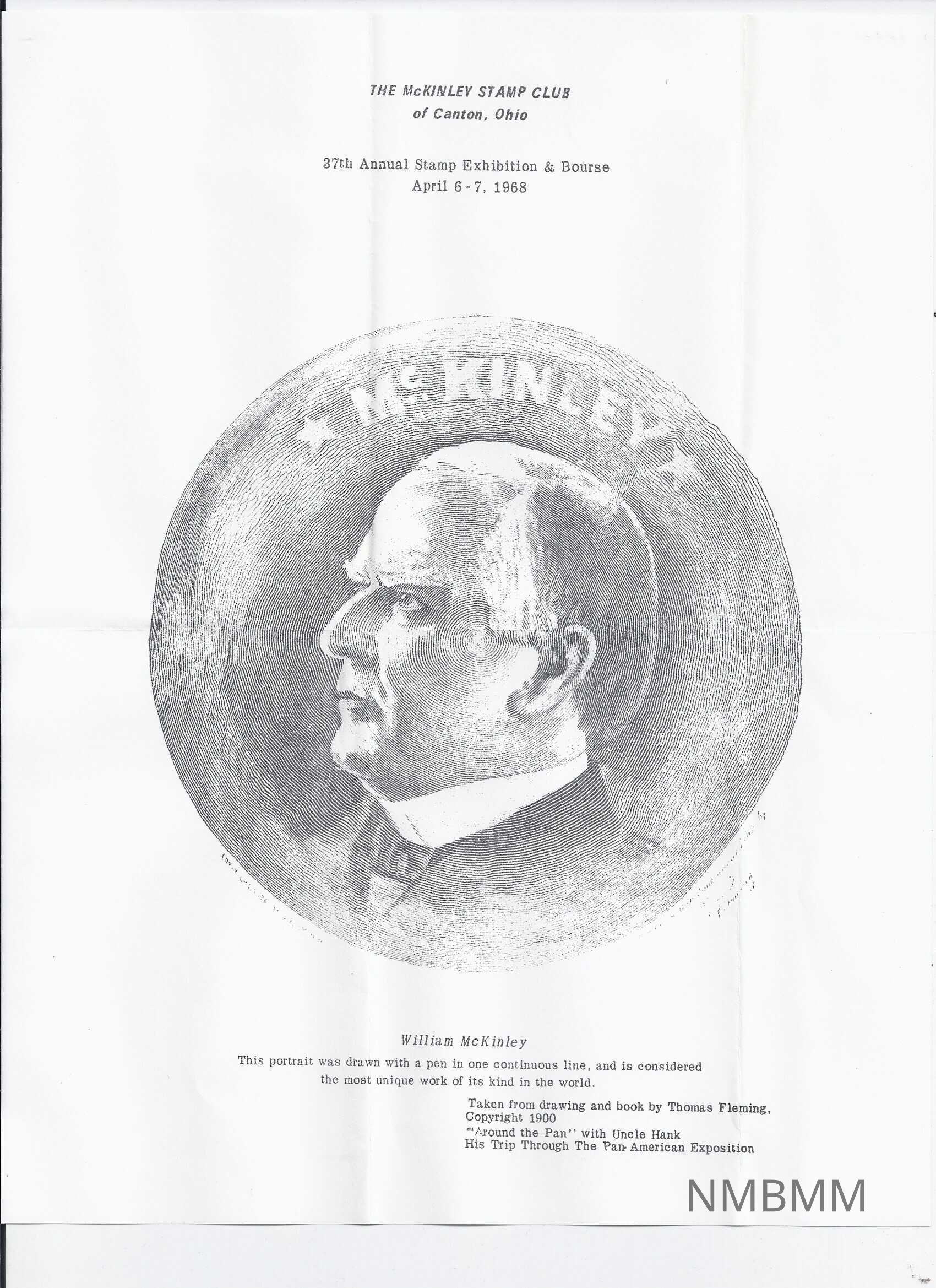 McKinley Stamp Club Flyer. The flyer is in black ink and printed on white paper. The flyer is as follows. The words "McKinley Stamp Club of Canton Ohio" are in the header. Directly beneath the header is the subheader "37th Annual Stamp Exhibition & Bourse April 6-7, 1968." Directly beneath the subheader is the same image of McKinley by Thomas Fleming as is on the matching envelope (2010.1.1927a). The caption reads: 'William McKinley This portrait was drawn with a pen in one continuous line, and is considered the most unique work of its kind in the world. Taken from drawing and book by Thomas Fleming, Copyright 1900 "Around the Pan" with Uncle Hank His Trip Through The Pan-American Exposition.'