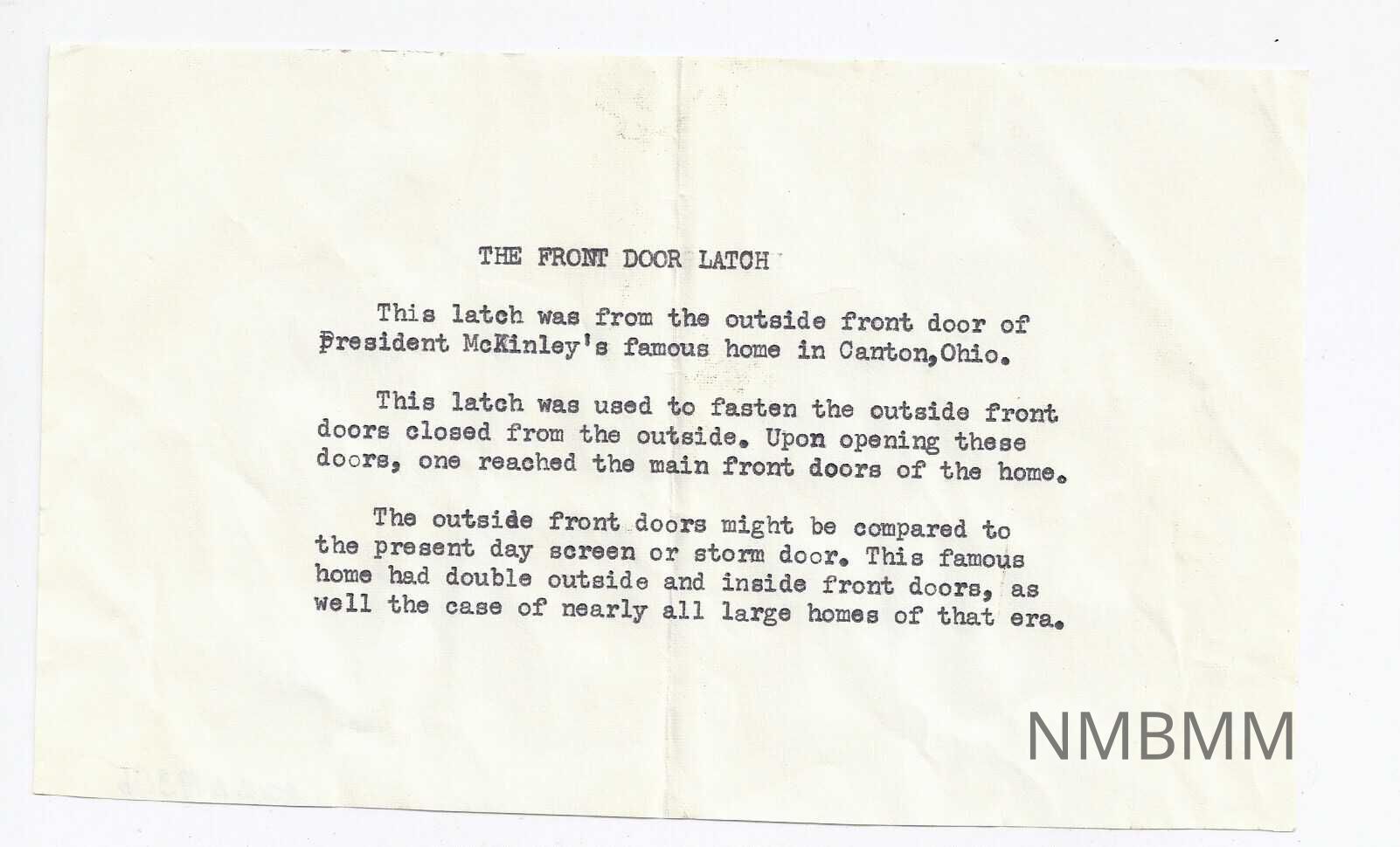 White paper with the following typed in black ink on the front: "THE FRONT DOOR LATCH This latch was from the outside front door of President McKinley's famous home in Canton, Ohio.