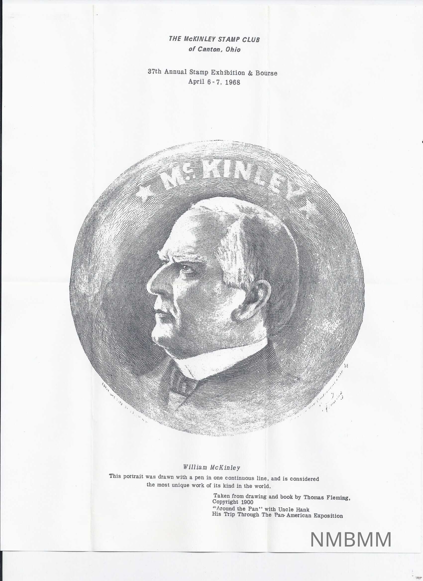 McKinley Stamp Club Flyer. The flyer is in black ink and printed on white paper. The flyer is as follows. The words "McKinley Stamp Club of Canton Ohio" are in the header. Directly beneath the header is the subheader "37th Annual Stamp Exhibition & Bourse April 6-7, 1968." Directly beneath the subheader is the same image of McKinley by Thomas Fleming as is on the matching envelope (2010.1.1927a). The caption reads: 'William McKinley This portrait was drawn with a pen in one continuous line, and is considered the most unique work of its kind in the world. Taken from drawing and book by Thomas Fleming, Copyright 1900 "Around the Pan" with Uncle Hank His Trip Through The Pan-American Exposition.'Collection