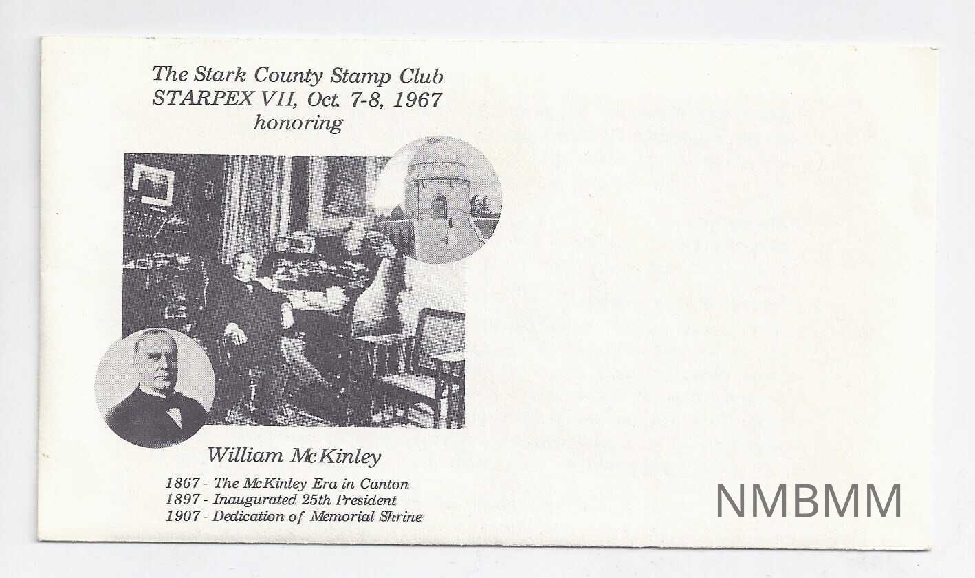 Stark County Stamp Club envelope. The right side of the envelope is blank. The left side is as follows. The upper left corner reads: "The Stark County Stamp Club STARPEX VIII, Oct. 7-8, 1967 honoring". Beneath this is a large photo of William McKinley seated at his desk, with an inset circular portrait of McKinley in the lower left corner and an inset circular photo of McKinley's tomb in the upper right corner of the larger photo. Beneath the photos is the following: "WIlliam McKinley 1867-The McKinley Era in Canton 1897-Inaugurated 25th President 1907-Dedication of Memorial Shrine." The back is blank.