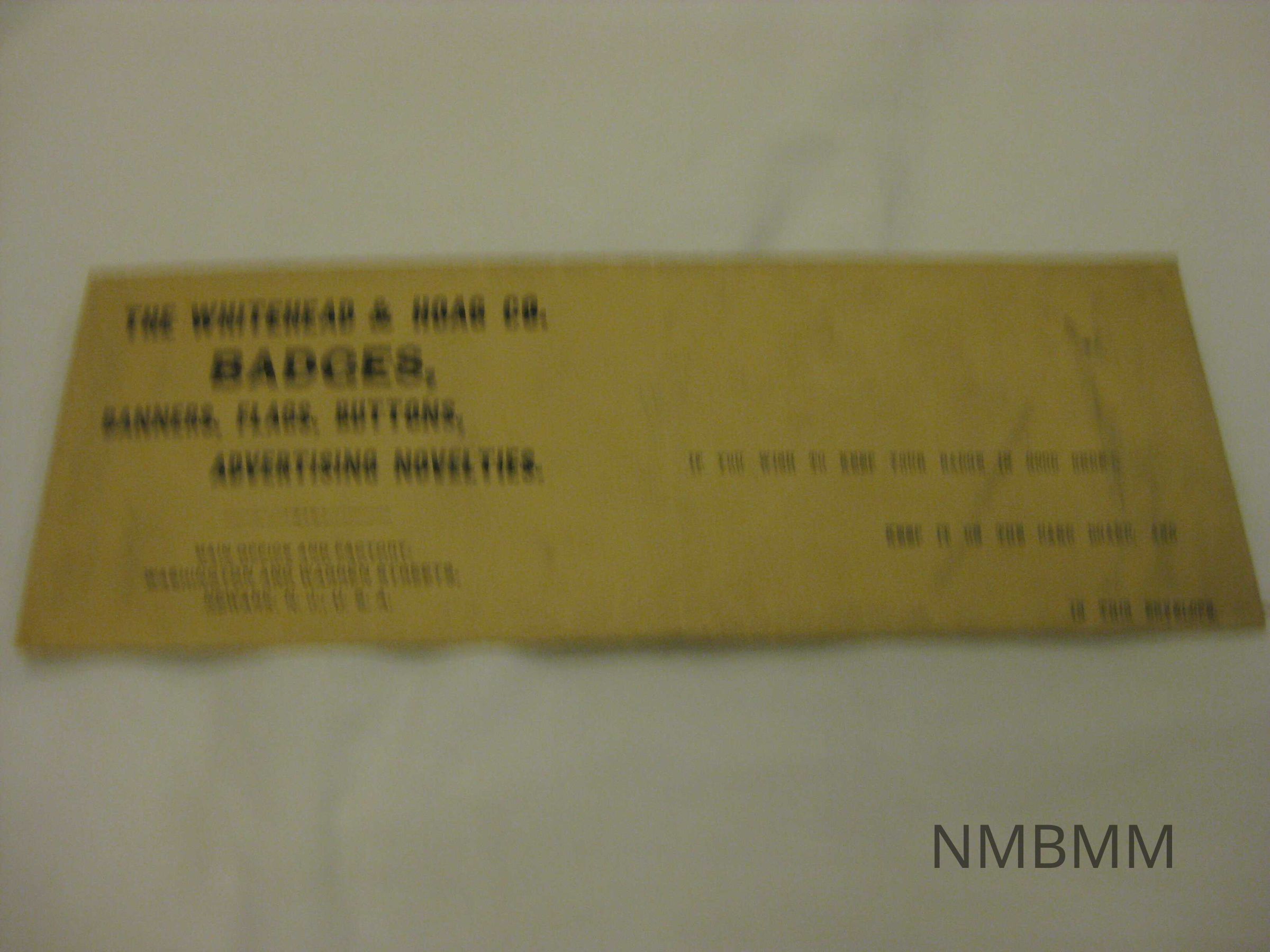 This item is an envelope from the Whitehead and Hoag Co. with two pieces of cardboard inside to use for safekeeping of buttons and badges. Printed in Newark, New Jersey, the envelope measures 9.5 by 3.5 inches and is discolored and dirty.Collection
