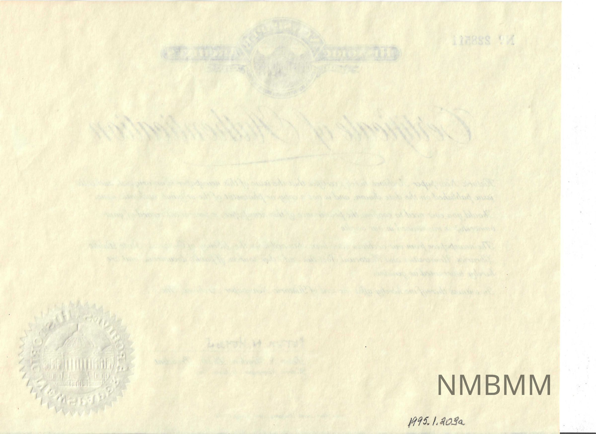 "Certificate of Authentication" from the Historic Newspaper Archives verifying the authenticity of the newpaper, the Boston Evening Transcript from Saturday, September 7, 1901, one day after President McKinley was shot. The headline of the newspaper reads, "President No Worse." The newspaper is 28 pages long, cost three cents, and was the last edition for the day.