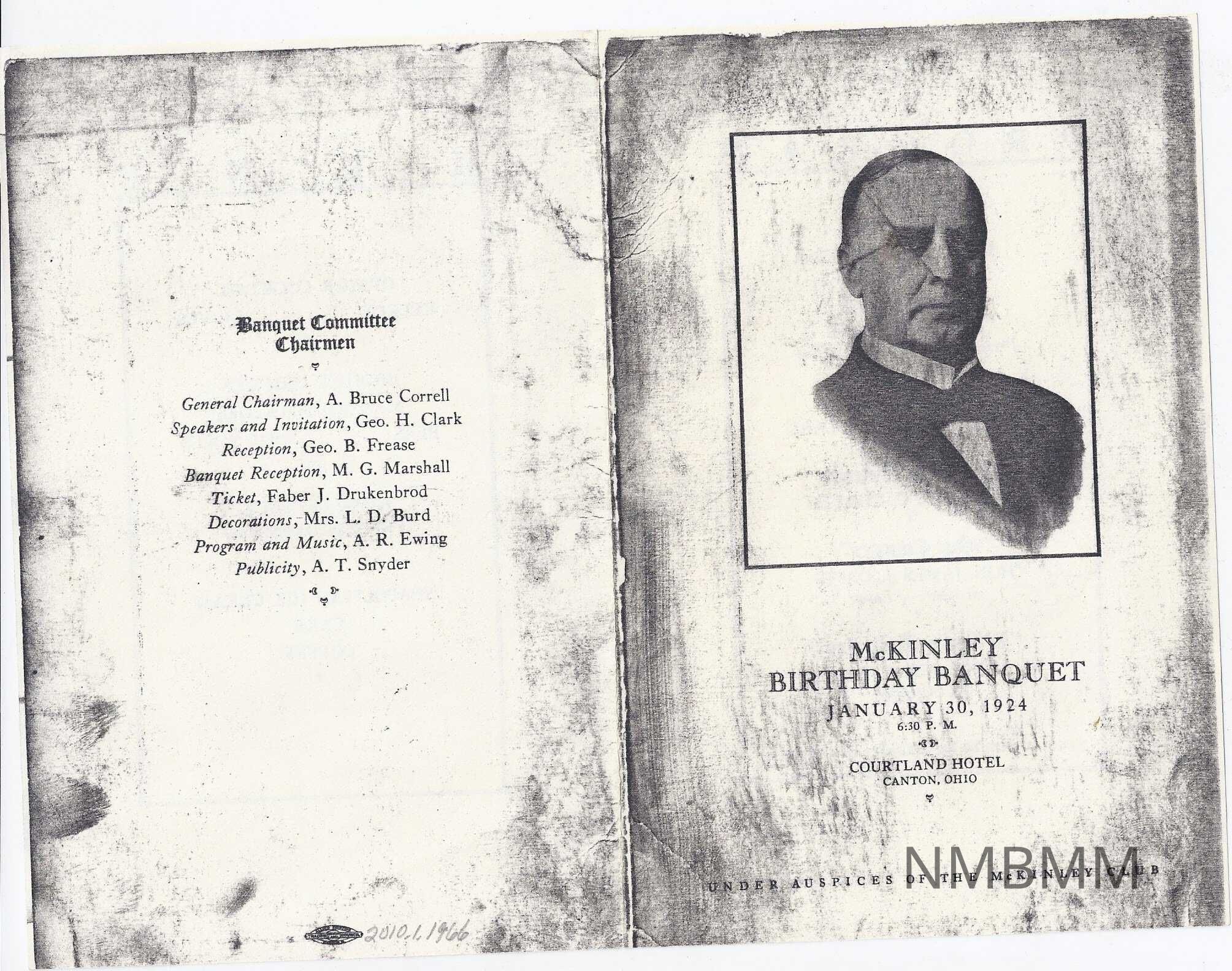 Xerox copy of program for the January 30, 1924 McKinley Birthday Banquet. The front of the program reads "McKinley Birthday Banquet January 30, 1924 6:30 P.M. Courtland Hotel Canton, Ohio Under Auspices of the McKinley Club." The back of the program has a list of the banquet committee chairmen. The inner pages of the program include the schedule of the program, and the menu.Collection