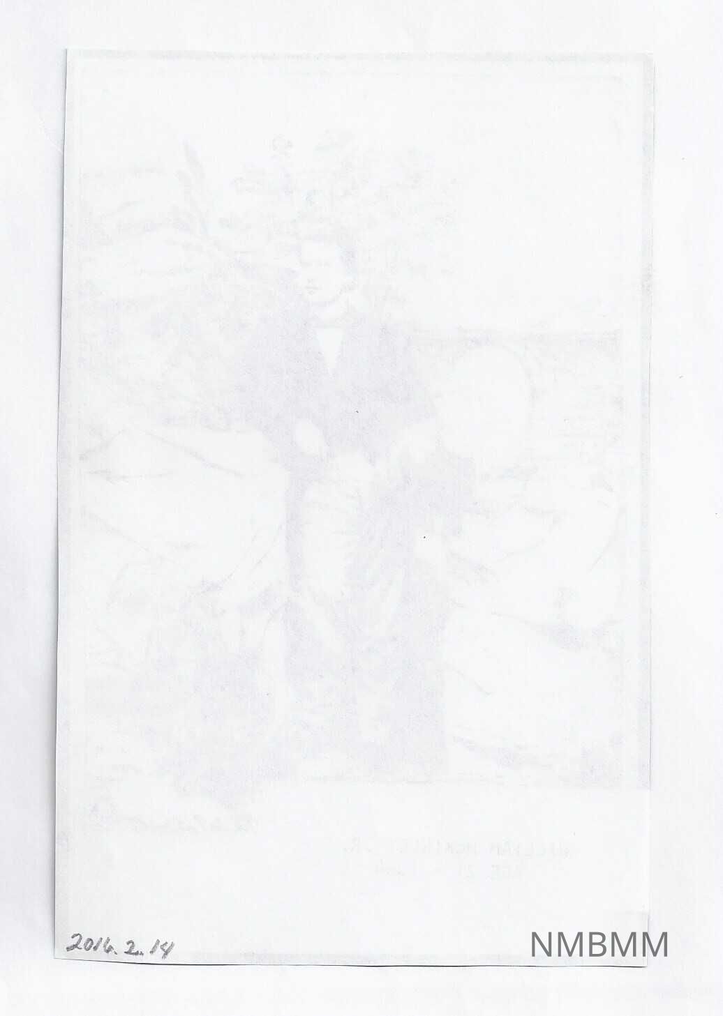 This is a xerox copy of William McKinley Jr. at age 21. In the bottom right hand cornor are numbers reading: 72.67.56. I do not know what these numbers are referring to. In the picture, young William is standing with his left foot prompted ontop of a rock, leaning against a pillar. It is unclear as of where he is, however, in the back ground appears to be a bridge; possibly an archway of some sort. He is holding a hat in his right hand. On the back side of the picture is blank.Collection