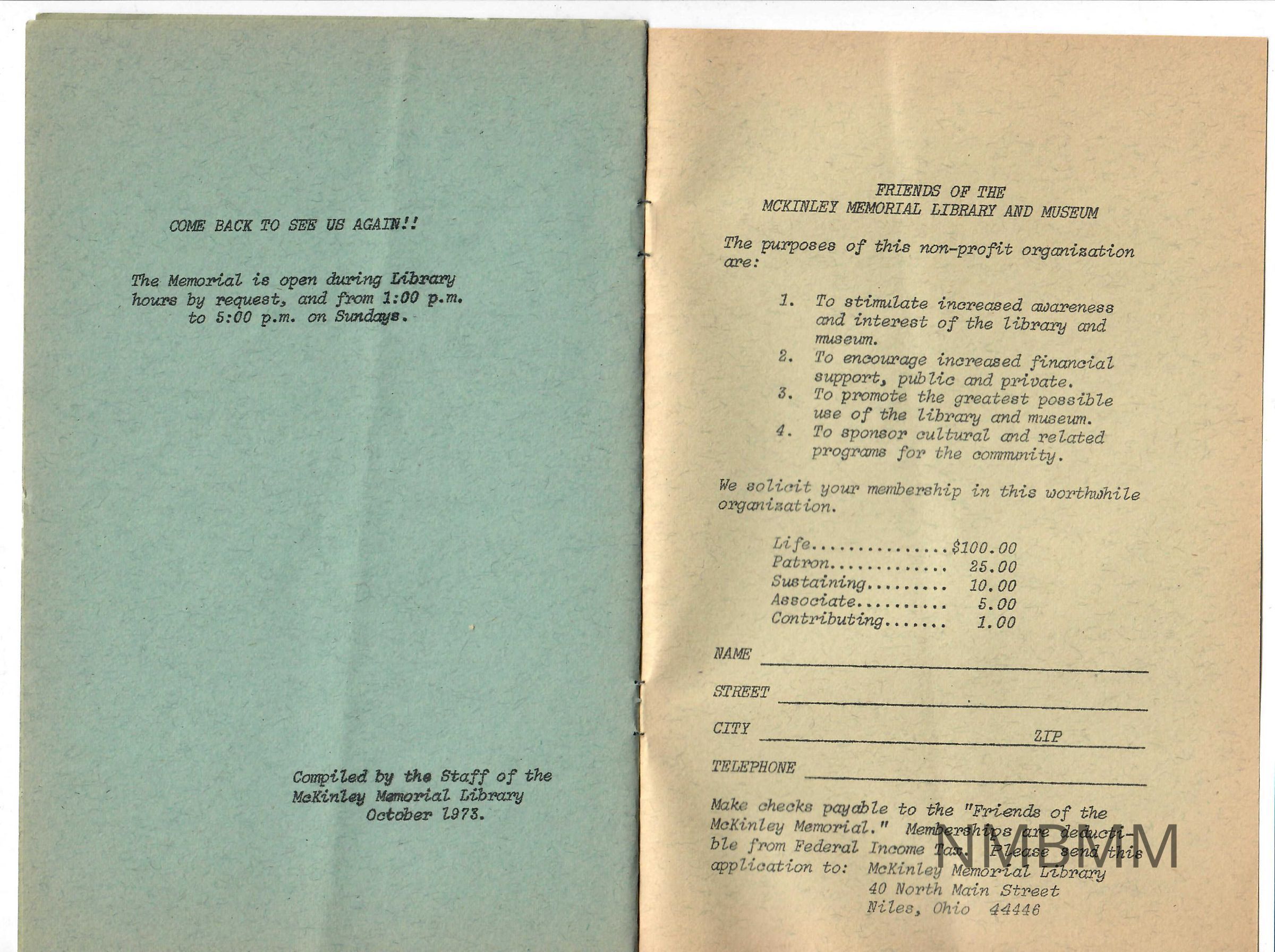 6.) Page 9: Invitation to return to the museum, with hours. The words "Compiled by the Staff of the McKinley Memorial Library October 1973" are at the bottom right corner. All is on green construction paper and typewritten in Italic font.