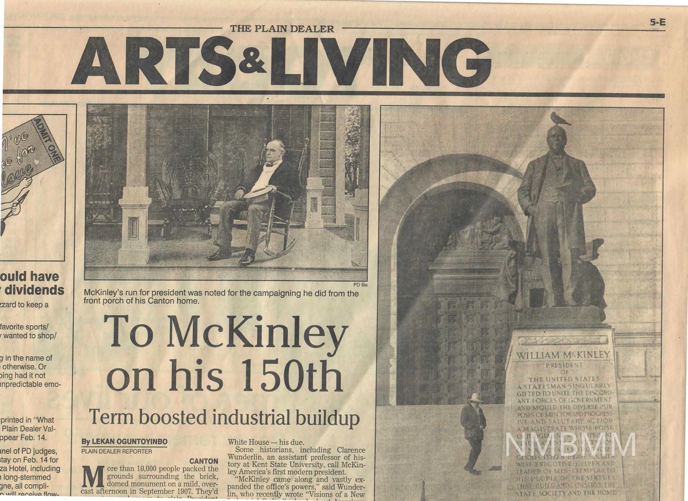 The page attached is Page 5-E , 6-E and part of 9-E of The Plain Dealer, dated January 28, 1993, containing an article titled "To McKinley on his 150th. Term boosted industrial buildup." by Lekan Oguntoyinbo.