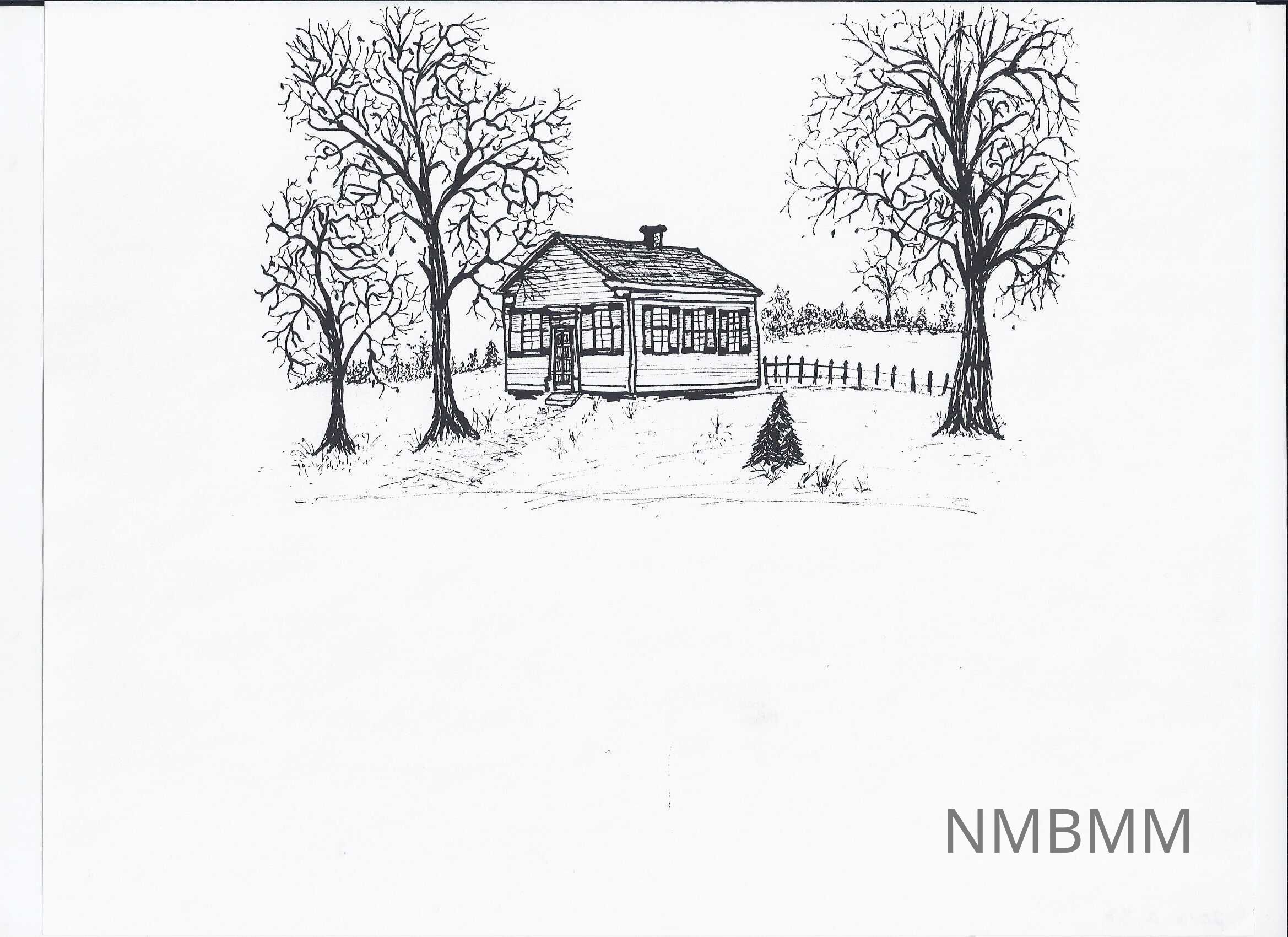 This is a xerox copy of a drawing of a one room schoolhouse.