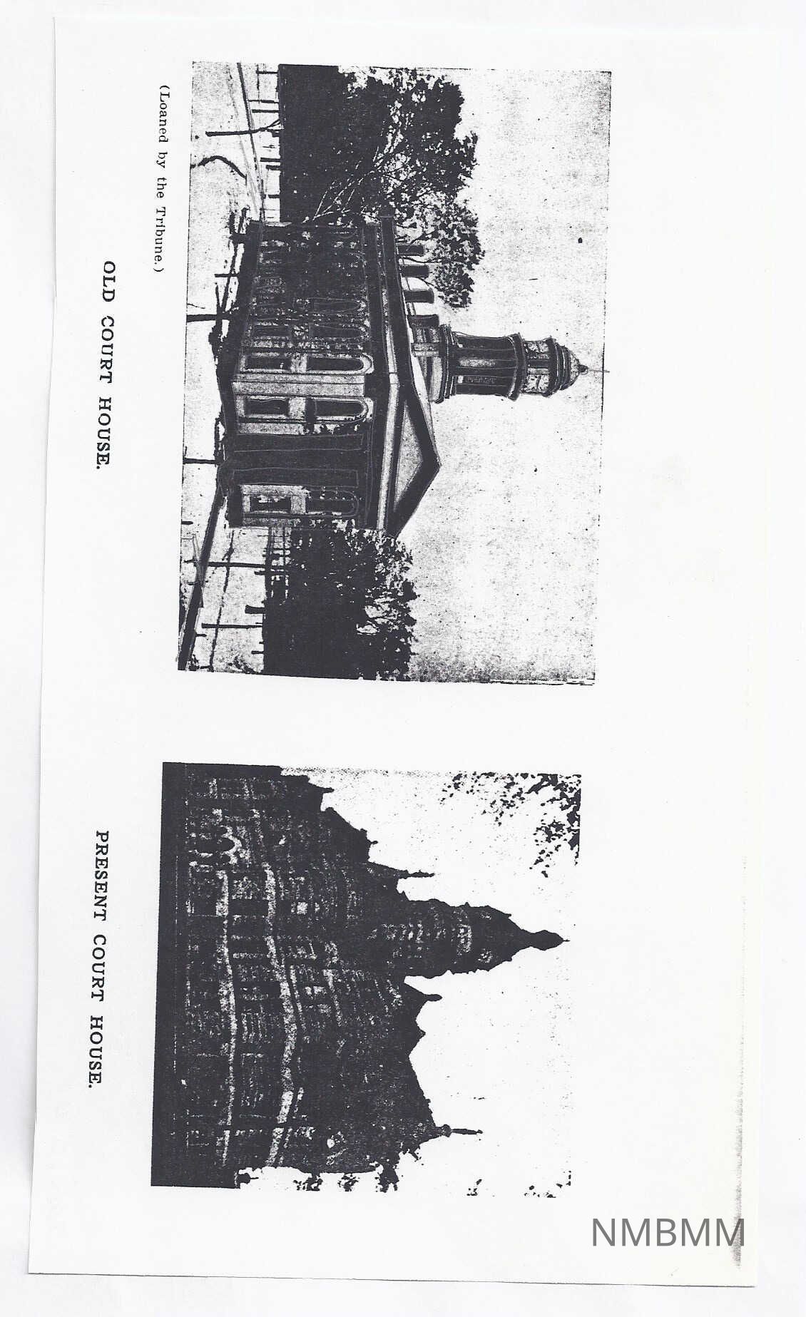 This is a xerox copy of two photographs containing Court Houses. The picture on the left is of the Old Court House and the picture on the right is of the Present Court House. Of the city is unknown. Photos loaned by the Tribune.