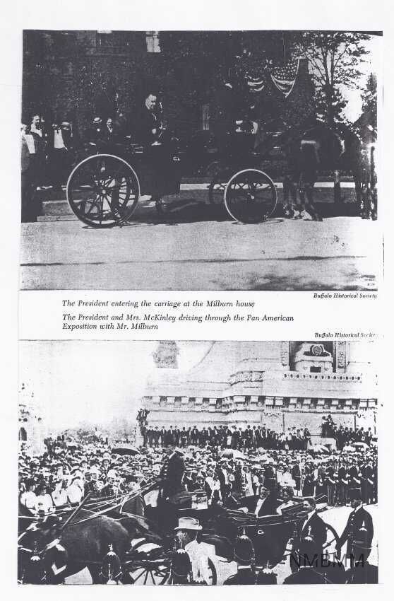 This is a xerox copy of two photographs. The top photo is of President McKinley: The President entering the carriage at the Milburn house. Courtsey of the Buffalo Historical Society. The bottom picture is the carriage throught the Pan-Am: The President and Mrs. McKinley driving through the Pan-Am Exposition with Mr. Milburn. Courtsey of the Buffalo Historical Society.