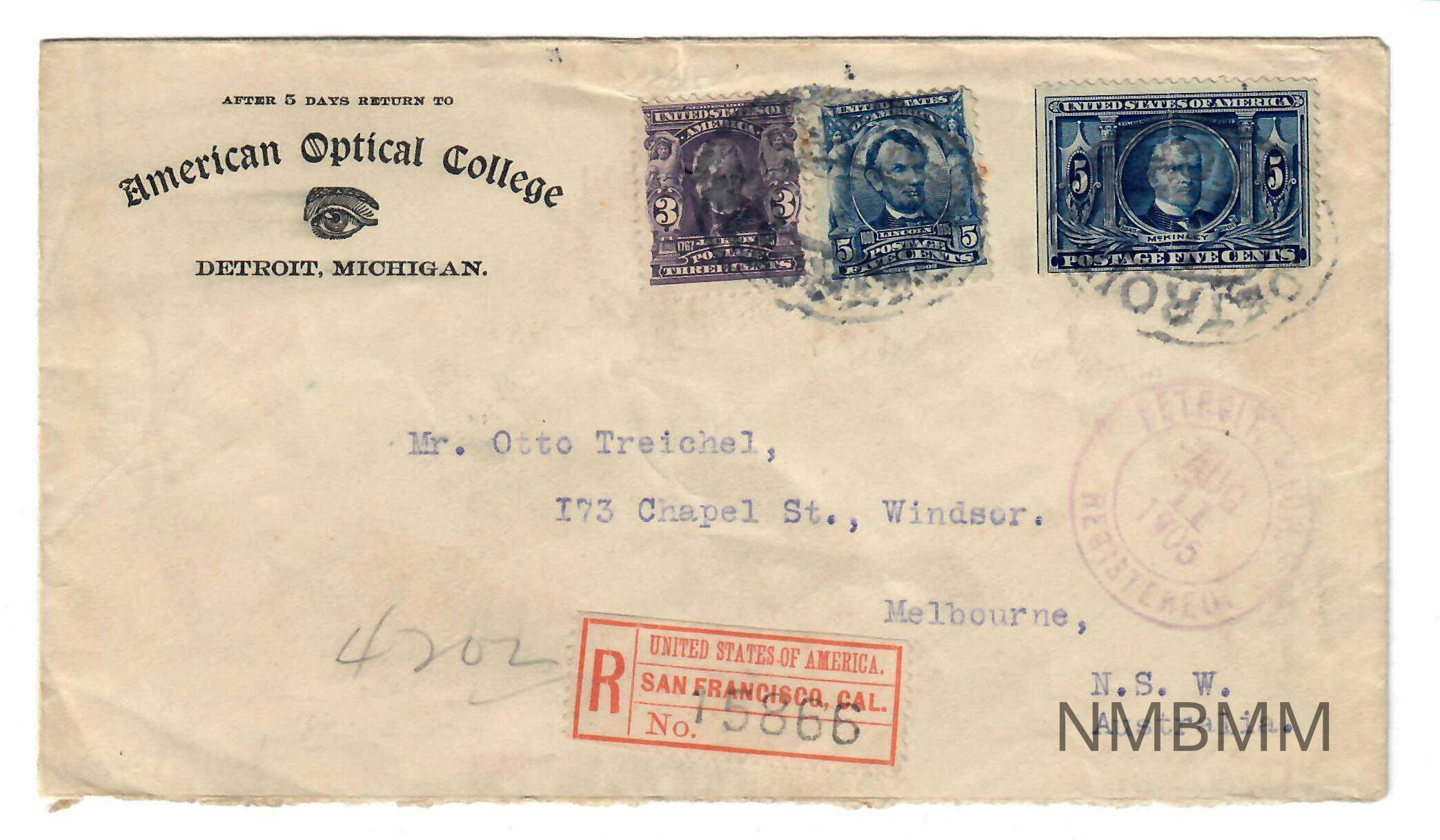 McKinley Five Cent Postage Stamp 1905 Envelope. Three stamps, with two Detroit postmarks atop, are affixed to the upper right hand corner of the envelope; a three cent purple (Andrew) "JACKSON, 1765-1815, UNITED STATES OF AMERICA POSTAGE" stamp, a blue five cent (Abraham) LINCOLN, 1800-1865, UNITED STATES OF AMERICA POSTAGE, SERIES 1902" stamp, and a blue five cent (William) "MCKINLEY, 1843-1901, UNITED STATES OF AMERICA, COMMEMORATIVE SERIES OF 1901" stamp. The return address reads in three lines of text, "AFTER 5 DAYS RETURN TO AMERICAN OPTICAL COLLEGE, DETROIT, MICHIGAN." An image of an eye is located between the 2nd and 3rd lines. The envelope is addressed to: "Mr. Otto Treichel, 173 Chapel St., Windsor. Melbourne, N.S. W. Australia." Under the address a label reads, "R UNITED STATES OF AMERICA. SAN FRANCISCO, CAL. NO. 15866," and written in pencil, "4202." A third postmark reads, "DETROIT, MICH. AUG 11 1905, REGISTERED." The back has two additional postmarks; "SAN FRANCISCO, CAL AUG 16 1905. REGISTERED F. D." and "MELBOURNE.5. REGISTERED." The date is not completely legible, [11.9.05].