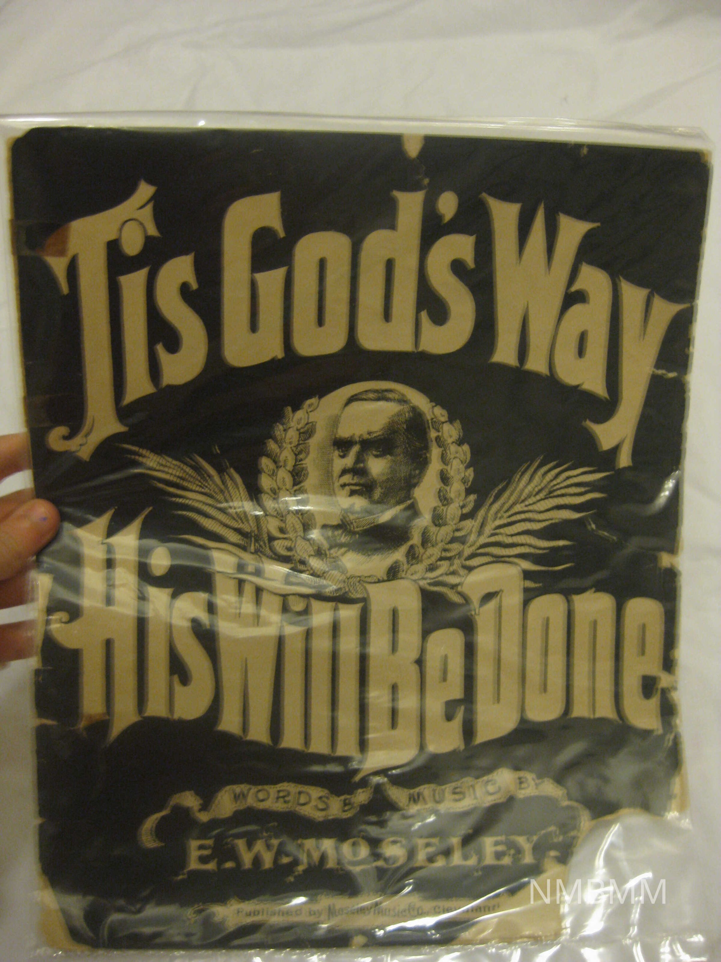 The item is a book of sheet music that has a tan cover with black lettering. The text reads "Tis God's Way, His Will Be Done." Words and music by E.W. Moseley. Published by Moseley Music Co., Cleveland Ohio." There is a portrait of McKinley in the center and other small decorations. The bottom right corner is torn off and the other pages are torn or frayed, binding loose. 12.75" by 10.25"