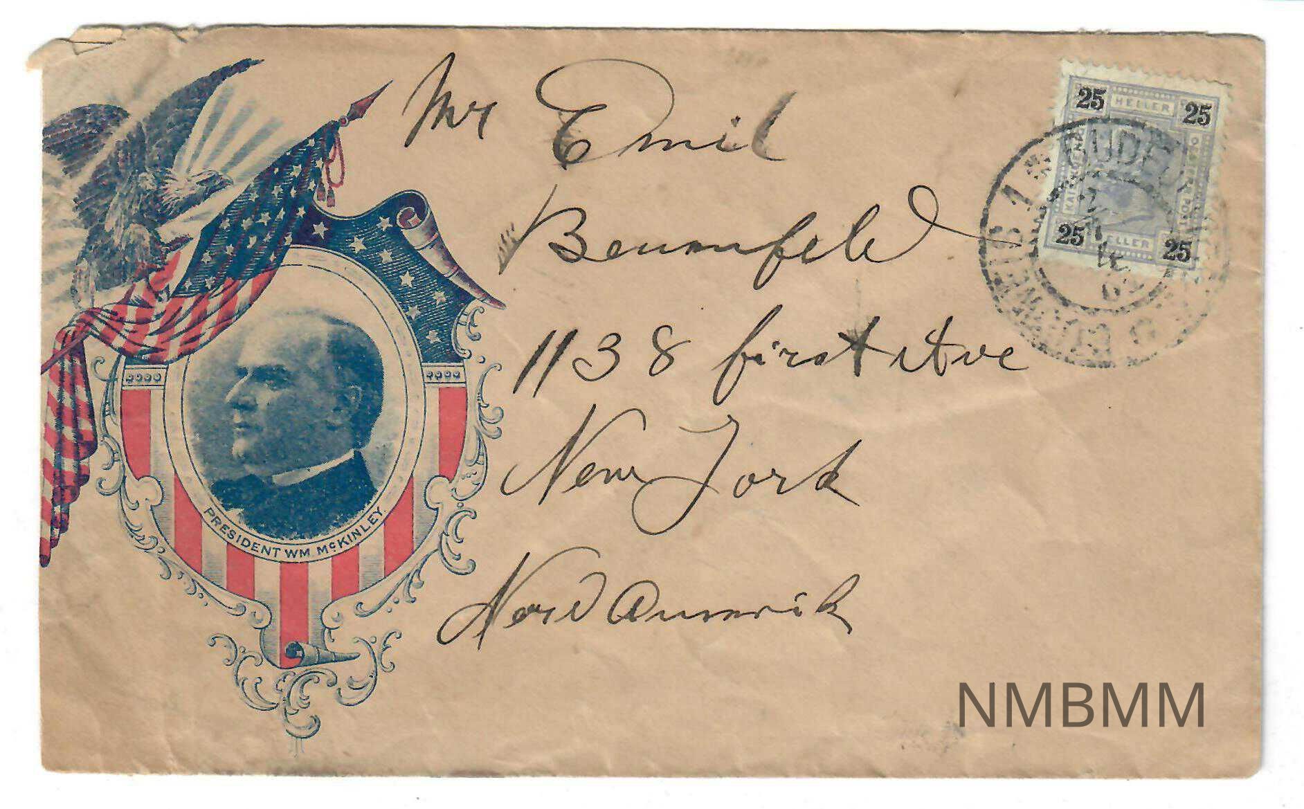 McKinley Patriotic Envelope Cover A colorful patriotic image of McKinley facing left is located on the left hand side of the envelope. His image is set in an ornamental shield with red and white stripes on the lower half and white stars on a blue background adorn the upper half. An eagle framed with blue and white rays and holding an American flag in his talons lies along the upper left hand portion of the shield. Below his image are the words "PRESIDENT WM. MCKINLEY." An Austrian twenty-five h Heller postage stamp with the image of Franz Josef is located in the upper right hand corner. The postmark is difficult to read, but is possibly [BUDWEIS BUDEJOVICE], a city in what is now the Czech Republic. The envelope is addressed to "Mr. Emil [Baumfeld], 1138 first ave, New York, [Nord Ammerik]." The return address is located on the back flap and written in script, making it difficult to read. It appears to be: "Korl Lobl, #24 Bafuraffa, Budweis Bujovice R. [Morordy]." A postmark is only partially legible, "7-13 [?] 5 A, N.Y."
