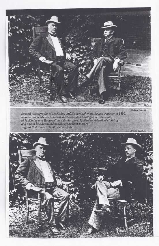 This is a xerox copy of two photographs. The top photograph is one of several photographs of McKinley and Hobart, taken in the late summer of 1899, were so much admired that the next summer a photograph was issued and a faint line down the middle of the later picture suggest that is was actually a composite. Courtsey of the Culver Service. The bottom photograph is a picture of President William McKinley and his second Vice President Theodore Roosevelt.Collection