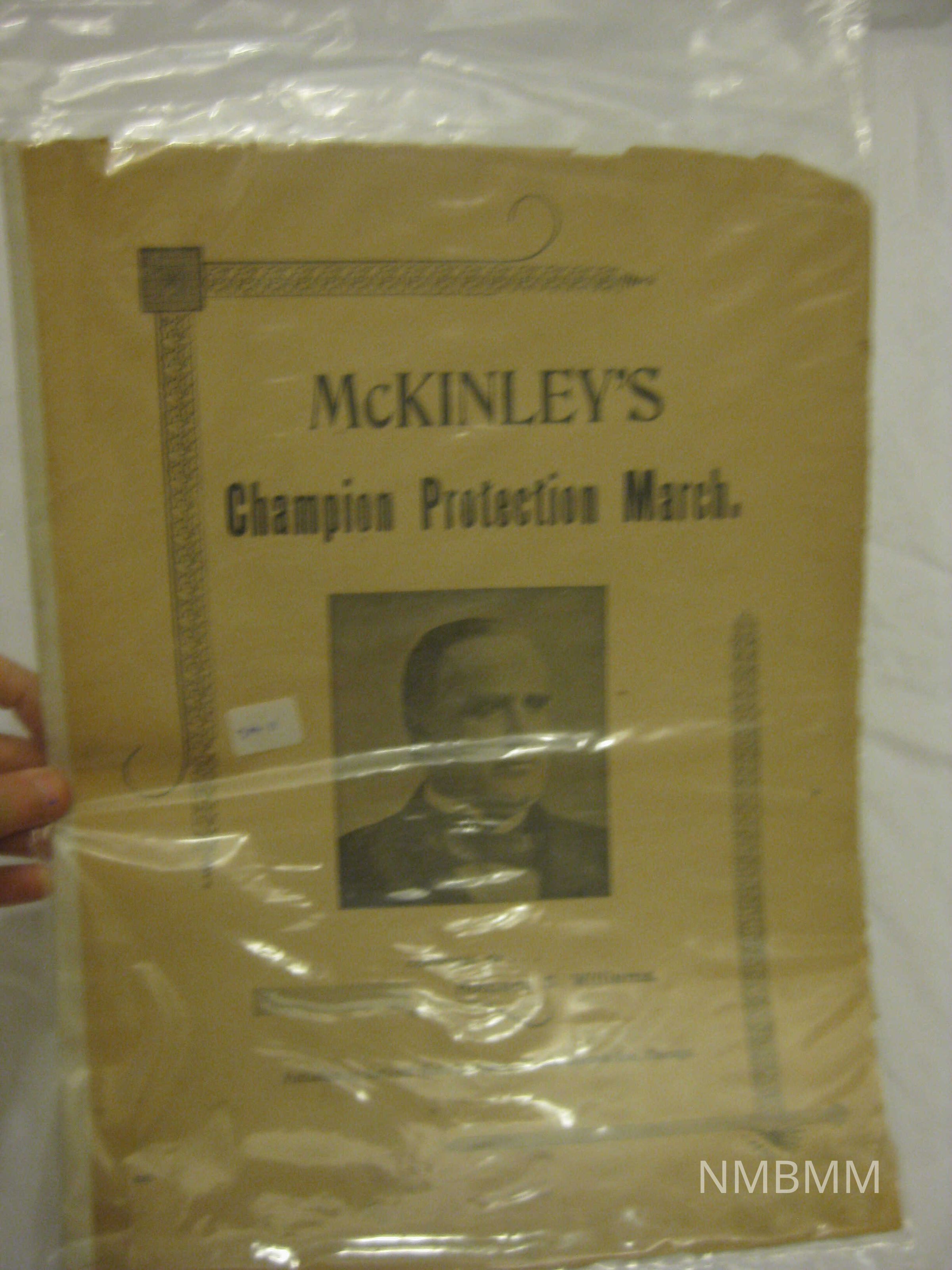 The item is a book of sheet music with a tan cover and black print. The text reads "McKinley's Champion Protection March. Composed by Howard S. Williams. Published by National Music Company. 215-221 Wabash Ave., Chicago." There is a black and white picture of McKinley in the center and some designs around the outside. The back features and advertisement. Badly discolored and ripped. 13.9" by 10.4" Tan cover and black print. There is a black and white picture of McKinley in the center and some designs around the outside. The back features and advertisement. Badly discolored and ripped. 13.9" by 10.4"