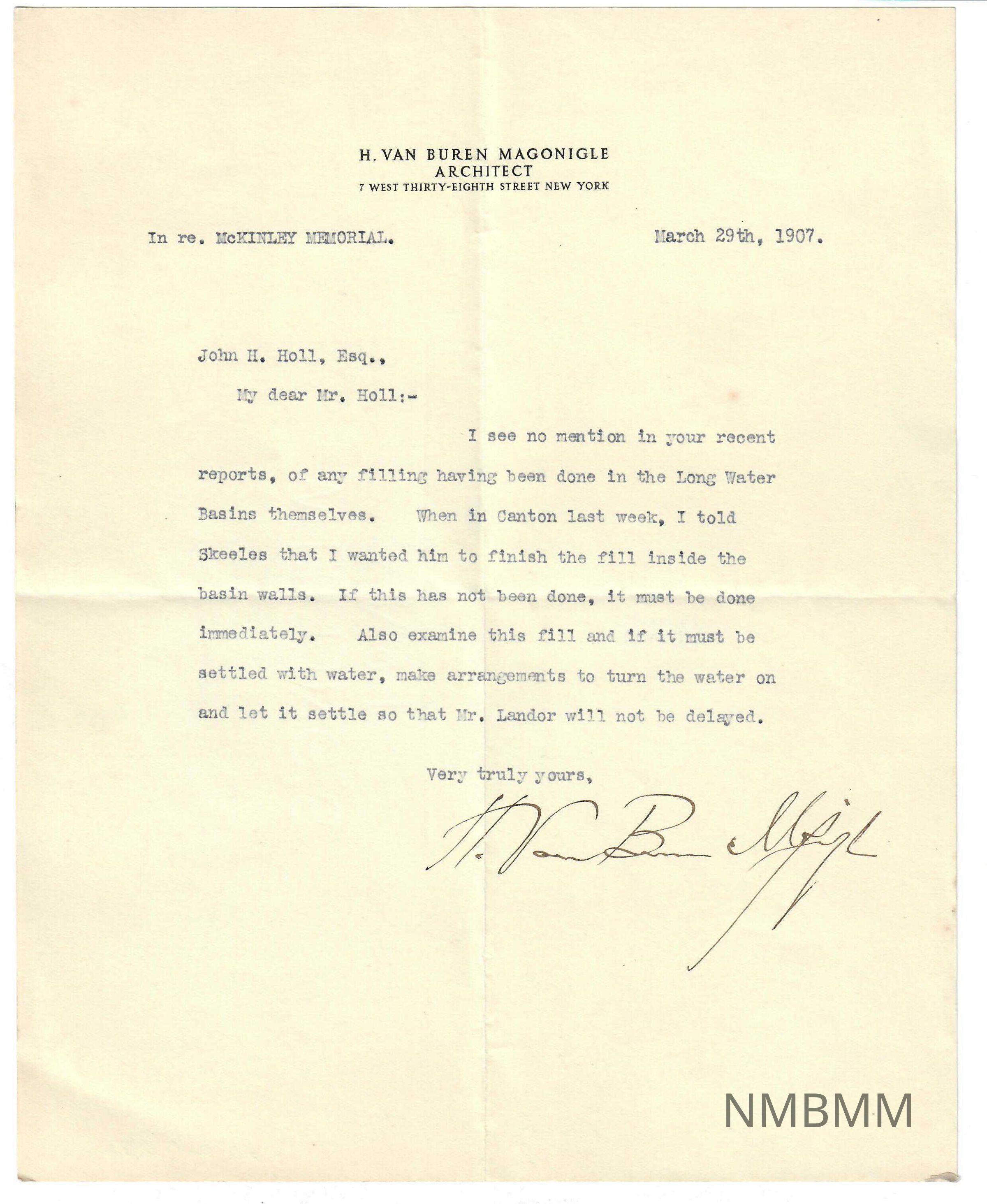 Letter to John H. Holl from H. Van Buren Magonigle, Architect.Entry/Object ID