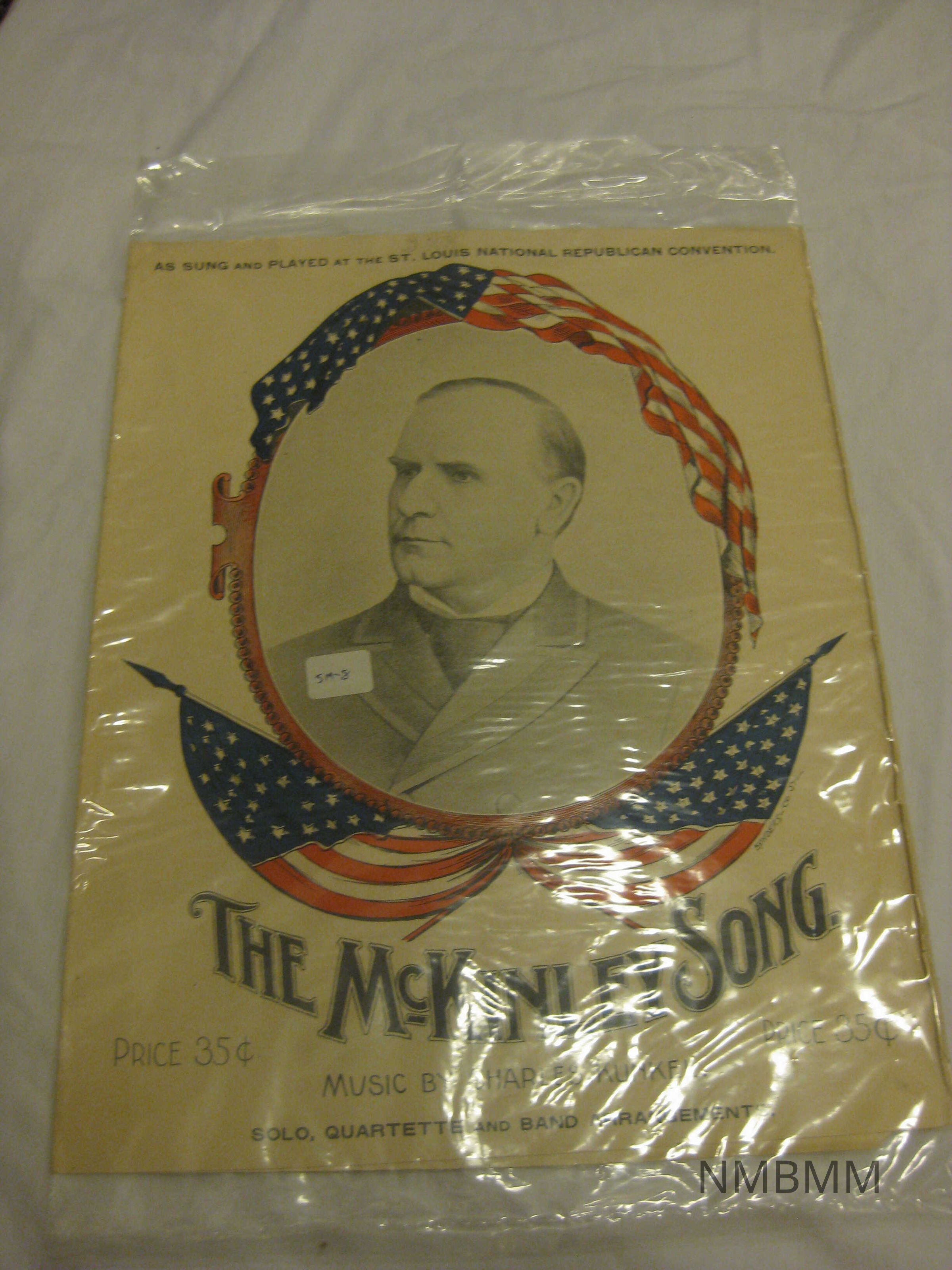 The item is a book of sheet music with a red, white and blue cover with black print. The text reads "The McKinley Song. Music by Charles Kunkel. Solo, quartet and band arrangements. Price 35 cents. As sung and played at the St. Louis National Republican Convention." Black and white image of McKinley in the center with a red border around the picture and surrounded by American flags. 14" by 10.75"