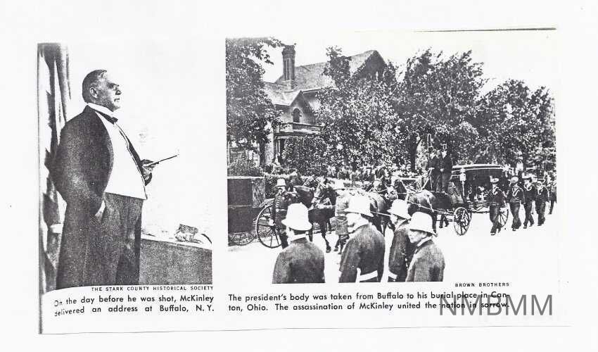 This is a xerx copy of two photographs. The photograph on the left was taken on the day before he was shot, McKinley delivered an address at Buffalo, N.Y. Courtsey of the Stark County Historical Society. The photograph on the right is of the president's body which was taken from Buffalo to his burial place in Canton, Ohio. The assassination of McKinley united the nation in sorrow. Courtsey of the Brown Brothers.Collection