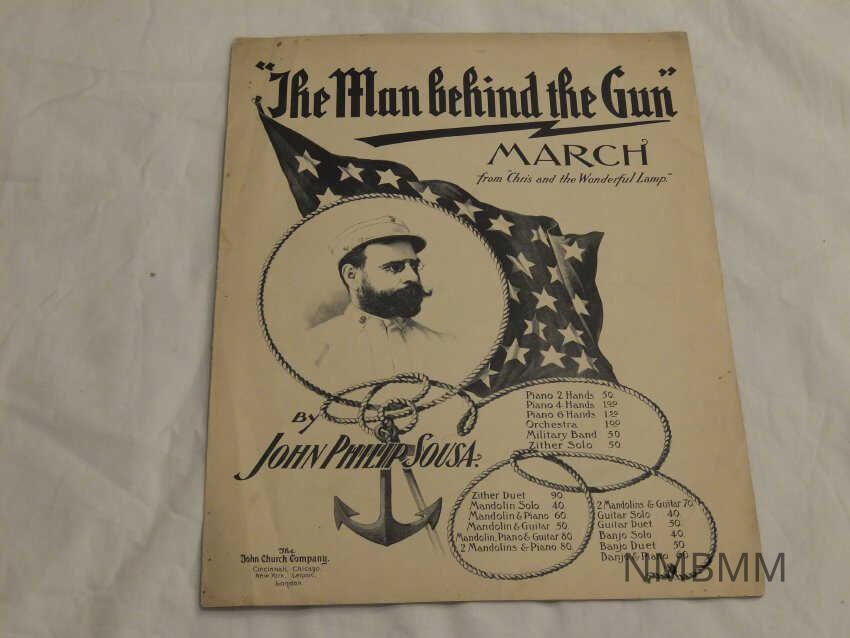 This item is a book of music written by John Philip Sousa. The front contains a portrait of a soldier in front of an American flag, and it is titled "The Man Behind the Gun." Also, the front reads, "March from 'Chris and the Wonderful Lamp.'" The back of the book contains other works by Sousa. Published by the John Church Company, Cincinnati, Chicago, New York, Leipsie, and London. "This sheet music is for the song “The Man Behind the Gun” March. The song was composed by John Philip Sousa, and published by The John Church Company in 1899. The cover features an illustrated portrait of John Philip Sousa with a rope tied to an anchor in front of a flag of stars. The song was part of the musical “Chris and the Wonderful Lamp,” which Sousa wrote the music for. " * *The National Museum of American History, http://americanhistory.si.edu/collections/search/object/nmah_670690 Front contains a portrait of a soldier in front of an American flag.