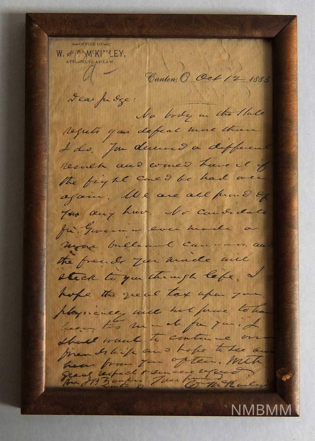 Letter from William McKinley at law office in Canton, Ohio to Judge Joseph B. Foraker regarding the judge's defted in the 1883 Ohio Govenor's Election, dated October 12, 1883. The letterhead reads "Office of W. and A. McKinley, Attorneys-at-Law."