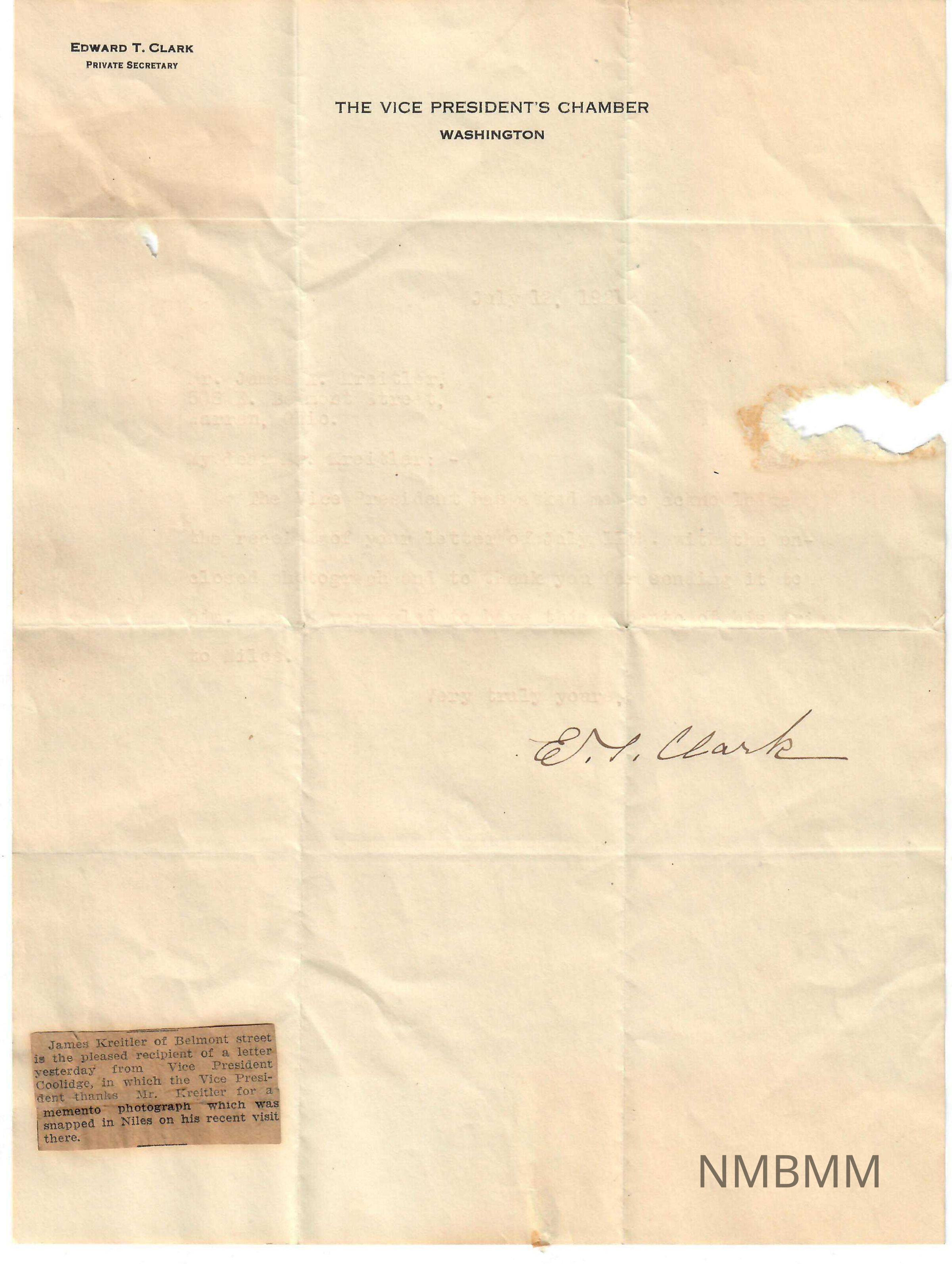 Letter of thanks from Edward T Clark, Private Secretary, to James A. Kreitler dated July 12, 1921, for Vice President Coolidge in receipt of the photograph Mr. Kreitler took June 18, 1921, at the dedication of the bust of President Warren G. Harding at the National McKinley Birthplace Memorial in Niles, Ohio. A small newpaper clipping has been glued to the bottom left hand corner of the letter. The back has residue remaining from where it was glued to a board. The letter reads as follows: "EDWARD T. CLARK PRIVATE SECRETARY THE VICE PRESIDENT'S CHAMBER WASHINGTON July 12, 1921 Mr. James A, Kreitler, 508 E. Belmont Street Warren, Ohio. My dear Mr. Kreitler: The Vice President has asked me to acknowledge the receipt of your letter of July 11, with the en- closed photograph and to thank you for sending it to him. [He is] very glad to have this memento of his trip to Niles. Very truly yours, E. T. Clark [signature]" Newspaper clipping reads: "James Kreiler of Belmont street is the pleased recipient of a letter yesterday from Vice President Coolidge, in which the Vice President thanks Mr. Kreitler for a memento photograph which was snapped on his recent visit there."