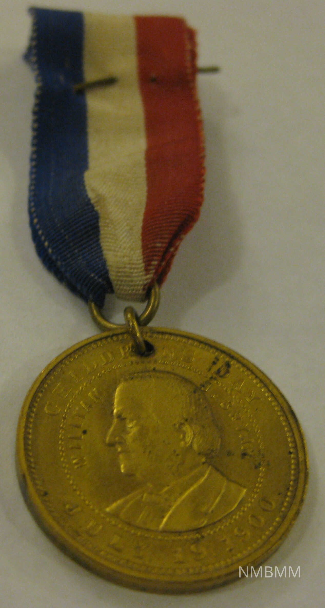 The item is a red, white, and blue political ribbon with pin featuring a gold dangle medal. On one side of the medal McKinley is engraved on the other Bryan is engraved. The medal is about 1 inch in diameter and the ribbon is 3 inches long and 3/4 inch in width. The text of the medal says. "Children's Day, July 19, 1900, Willow Grove Park Souvenir."Collection