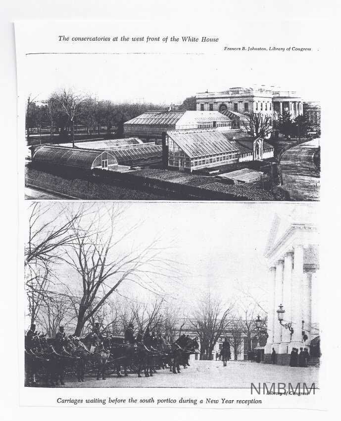 This is a xerox copy of two photographs of the White House. The top photograph are the conservatories at the west front of the White House. Courtsey of Frances B. Johnson, Library of Congress. The bottom photograph are carriages waiting before the south portico during a New Year reception. Courtsey of the Library of Congress.Collection