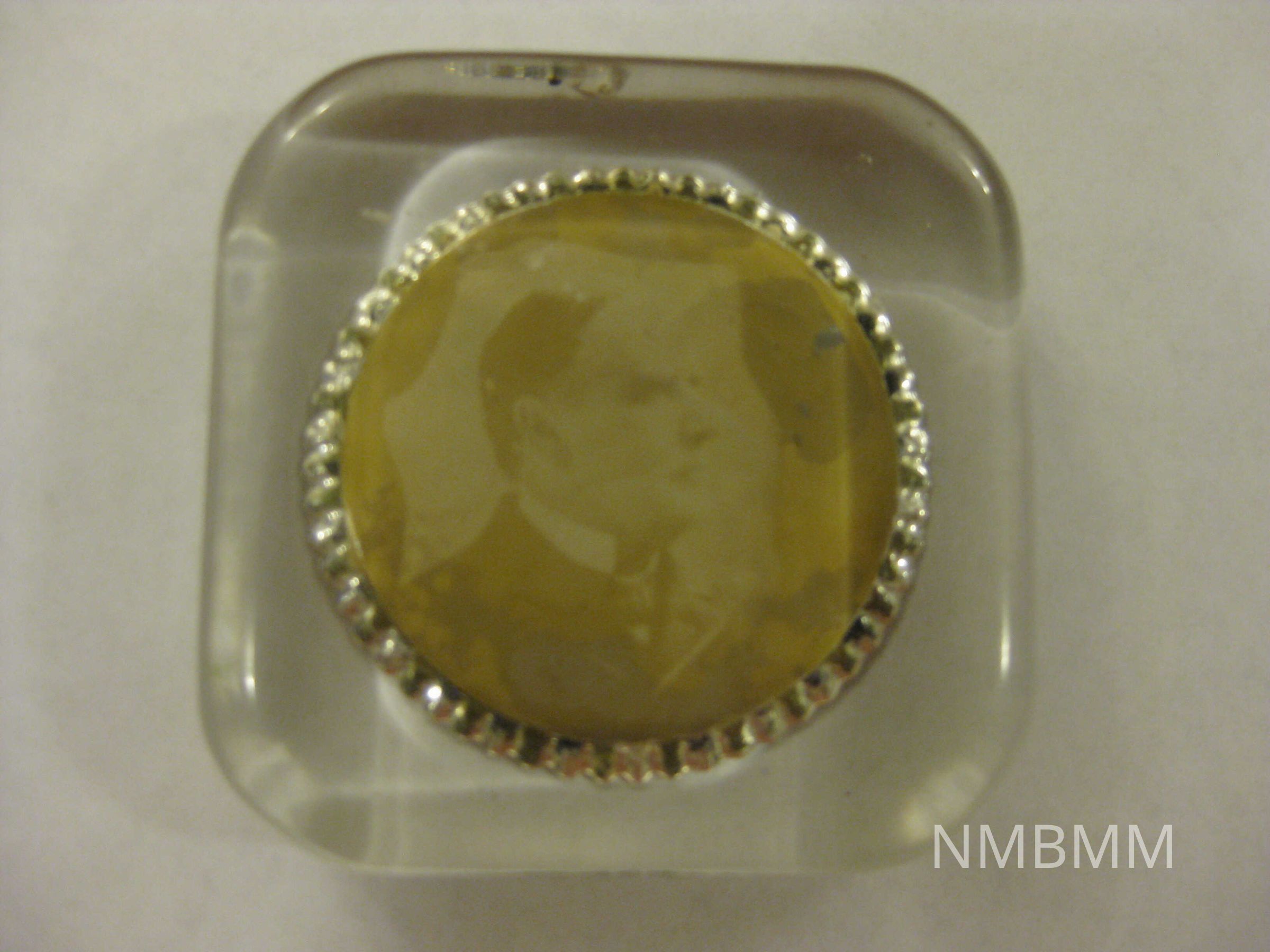 The item is a glass paperweight featuring a circle portrait of President McKinley. The backside of the paperweight is missing a seal so the back of the picture is exposed and chipping. The paint in the decorative grooves is also chipping. Manufactured by the Baltimore Novelty Works.